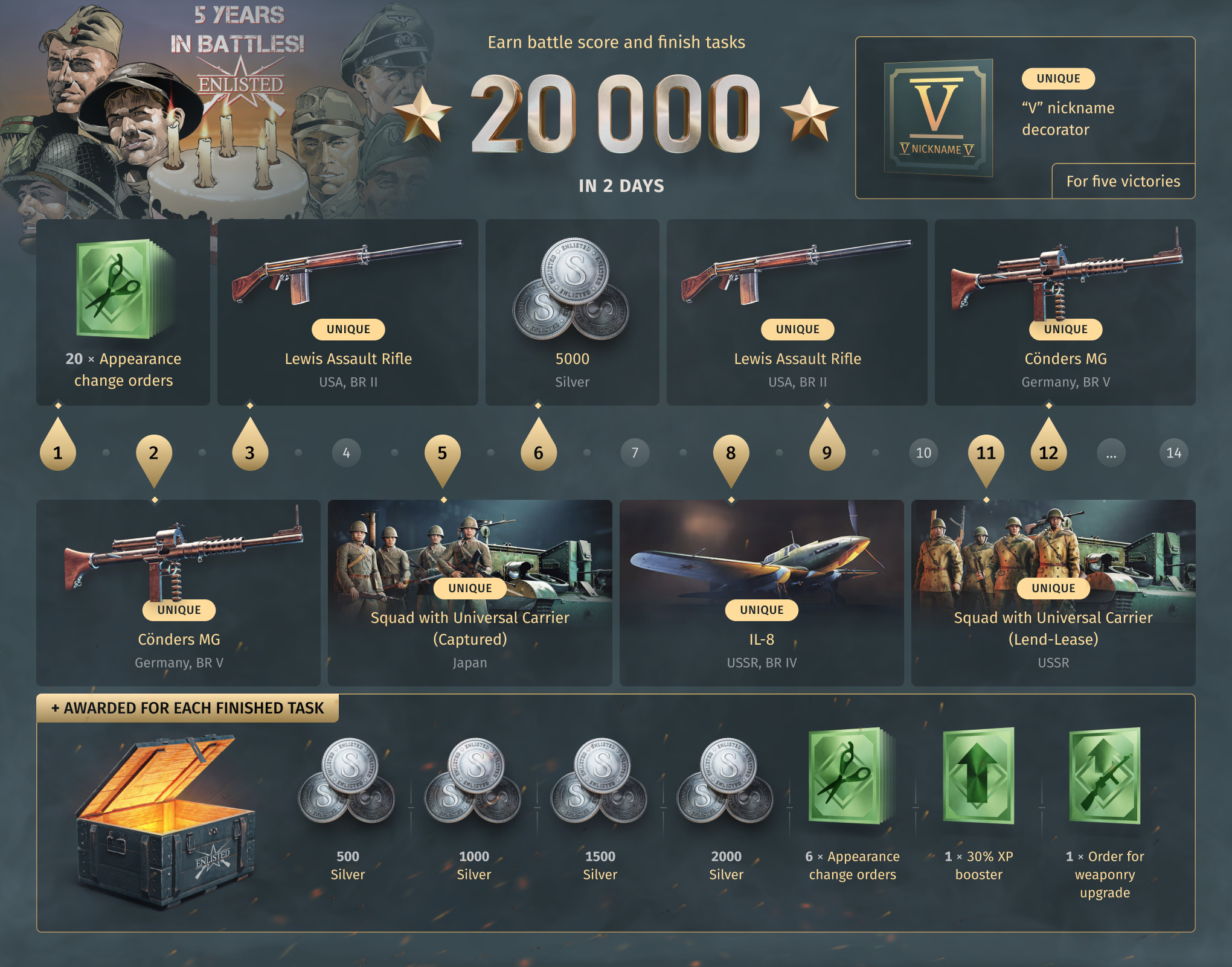 From November 10th (13:00 UTC) to December 8th (13:00 UTC), get battle score in battles and move up the rewards ladder! You have two days to complete each task! During the event, you can also get a unique nickname decorator commemorating the game’s fifth anniversary by achieving five victories.