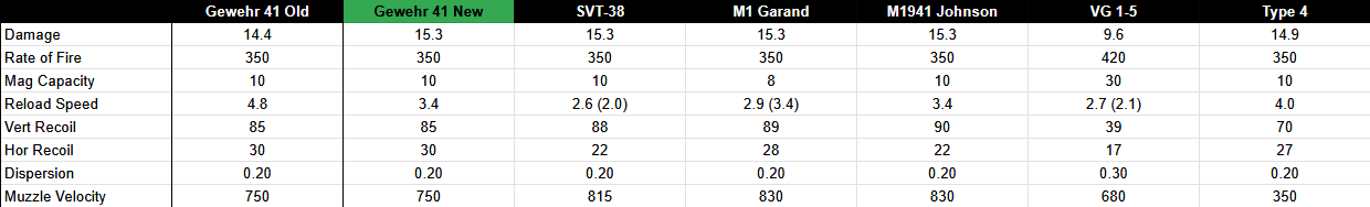My suggestion is to buff the Gewehr 41’s damage from 14.4 to 15.3, and the full reload speed from 4.8 to 3.4 seconds. This would place it’s performance to roughly equal to the M1941 Johnson, which has slightly worse recoil but better bullet velocity.