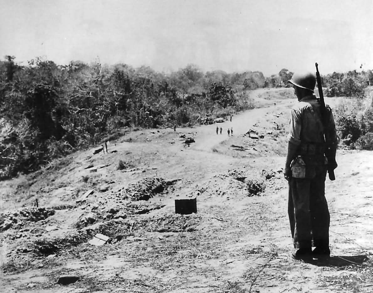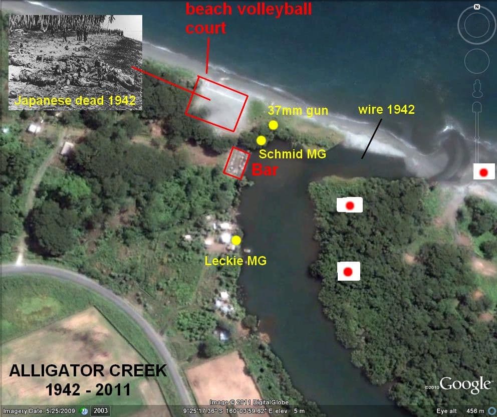 There were no buildings until you actually got to the field. It was only trenches, an outpost, and Coconut groves with a creek that was literally knee-deep, not waist-deep (unless you tried to wade through the ocean, which the Japs did.