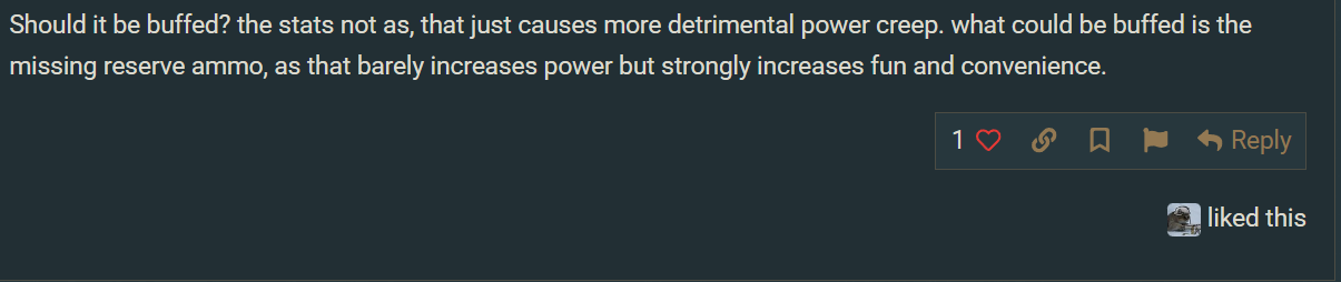 Should it be buffed? the stats not as, that just causes more detrimental power creep. what could be buffed is the missing reserve ammo, as that barely increases power but strongly increases fun and convenience.