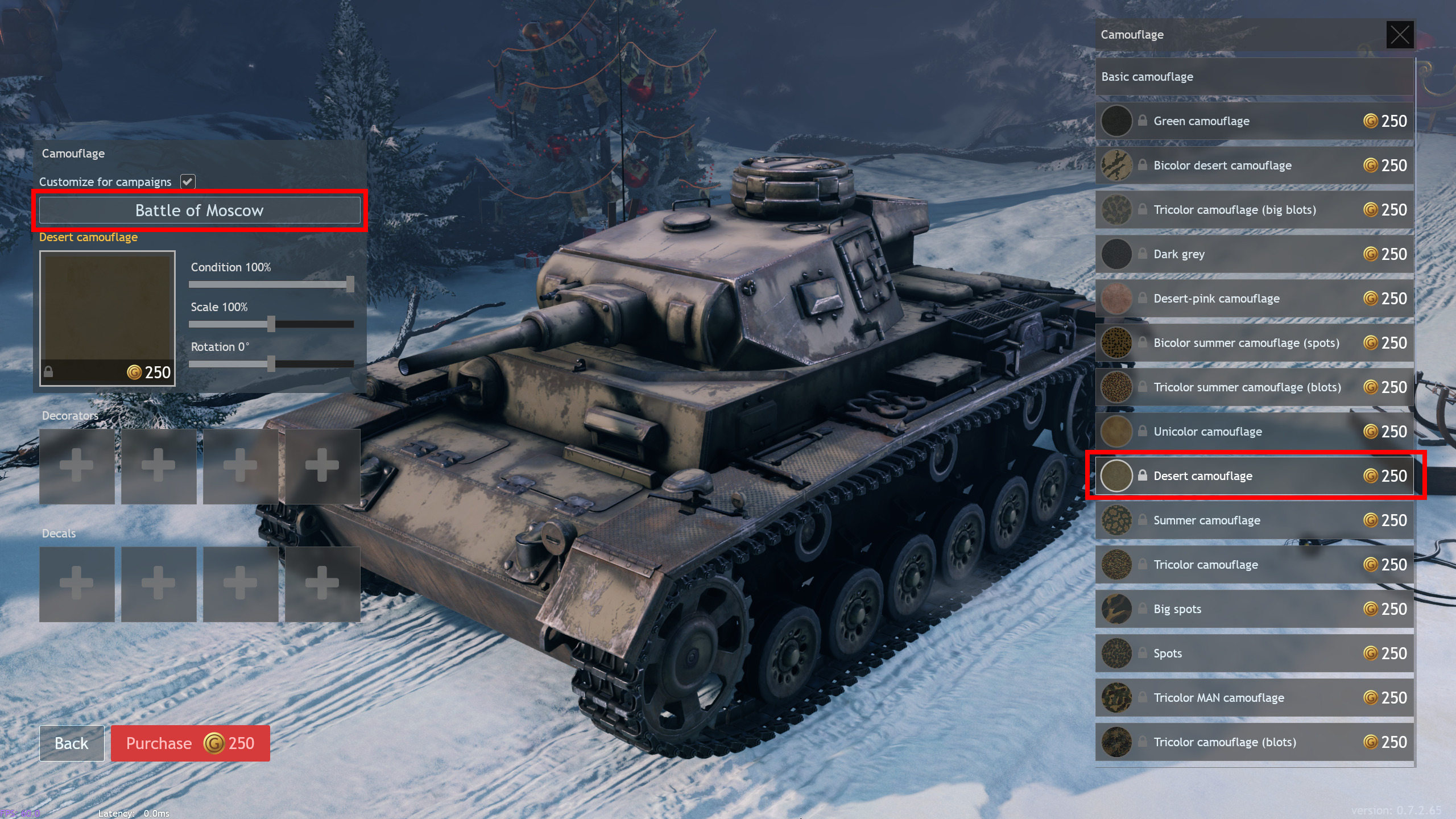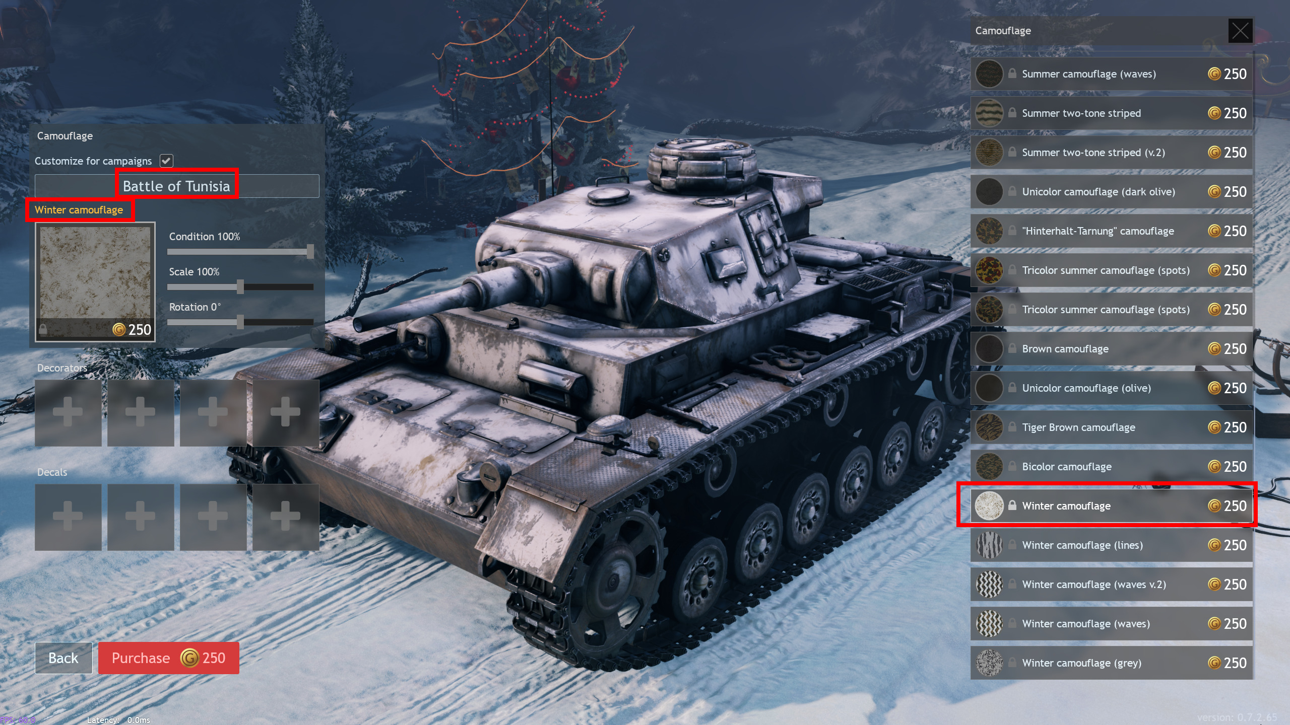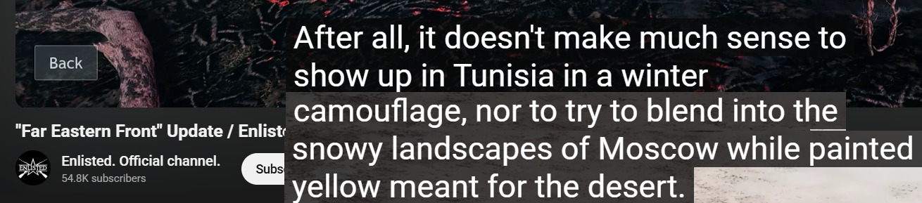 E.g. just like you can’t dress your soldier in desert uniform for Stalingrad, you shouldn’t be able to buy/equip “late winter” camouflage for Tunisia: