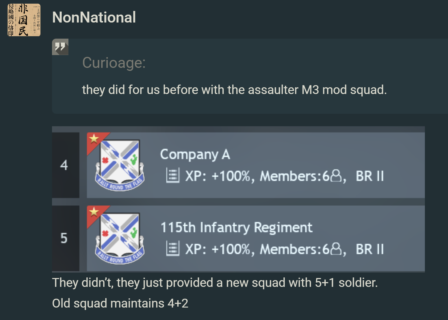 By the way, unless developers can allow people to choose whether to accept changes in squad members, I would oppose replacing any squad soldiers.