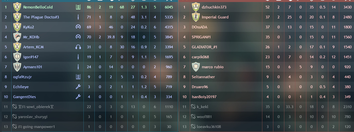 Having engineers and using powerful weapons, yet only scoring 1000 points or even less after a 20-minute battle.