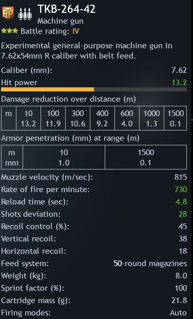 An experimental belt-fed machine gun with a 50-round belt of 7.62x54mmR cartridges. Perfect for both assaulting enemy positions and suppressing fire.