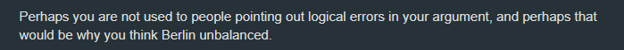 Perhaps you are not used to people pointing out logical errors in your argument, and perhaps that would be why you think Berlin unbalanced.