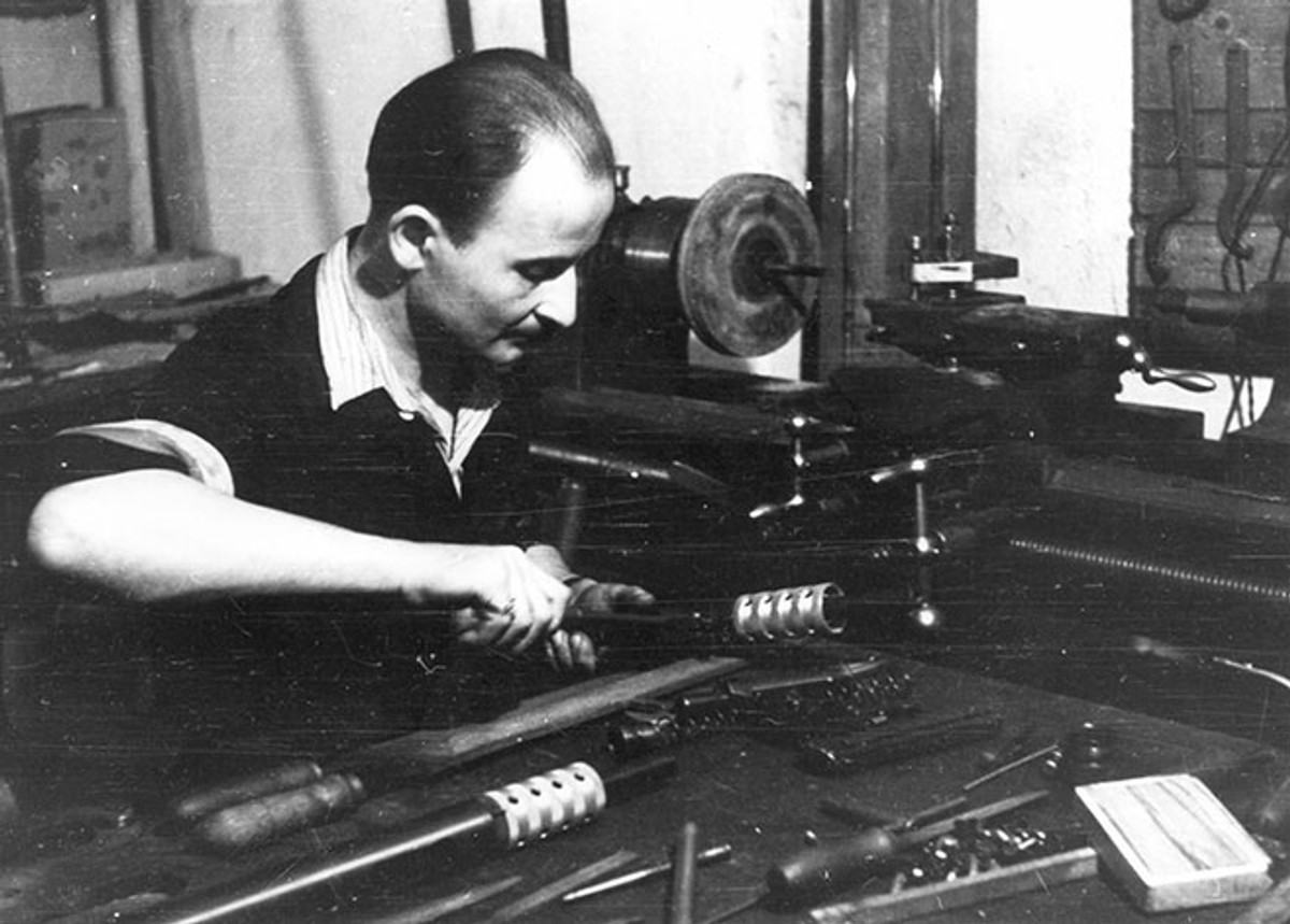 Оружейники варшавских повстанцев за изготовлением 9-мм пистолетов-пулеметов «Блыскавица» — военное фото