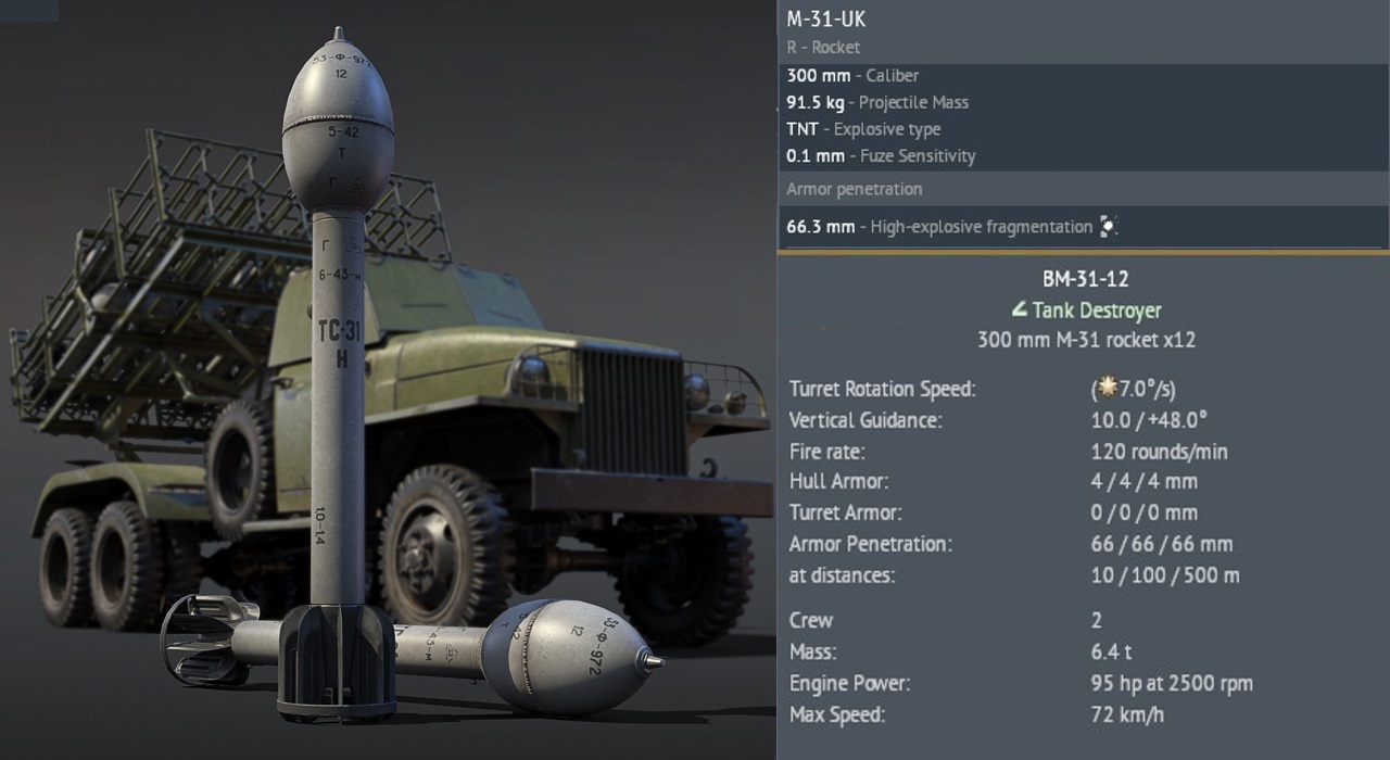 The main gameplay advantage of the BM-31 compared to most other MLRS is its low rocket speed, only 245 m/s for the M-31-UK rocket. This results in a minimum firing range of about 600m.