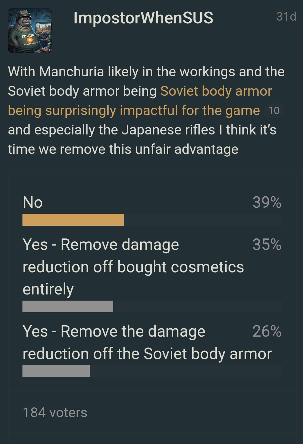 It’s a revisit. Devs said they don’t want to make changes as a ‘knee-jerk reaction’ and would rather see how the situation develops. I’ve waited for more than 2 weeks since the Manchuria update was introduced before making this post and a poll again so that devs can see that there’s no knee-jerking going on and people genuinely do not want body armor to give -10% reduction