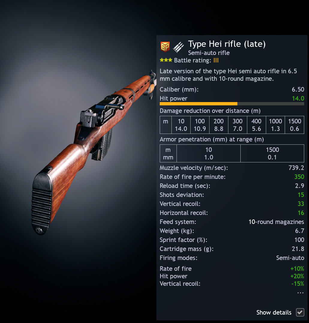 Type 1 Rifle - 46RPM --------------> 21.0 dmg , [6.5mm Arisaka at 770m/s]