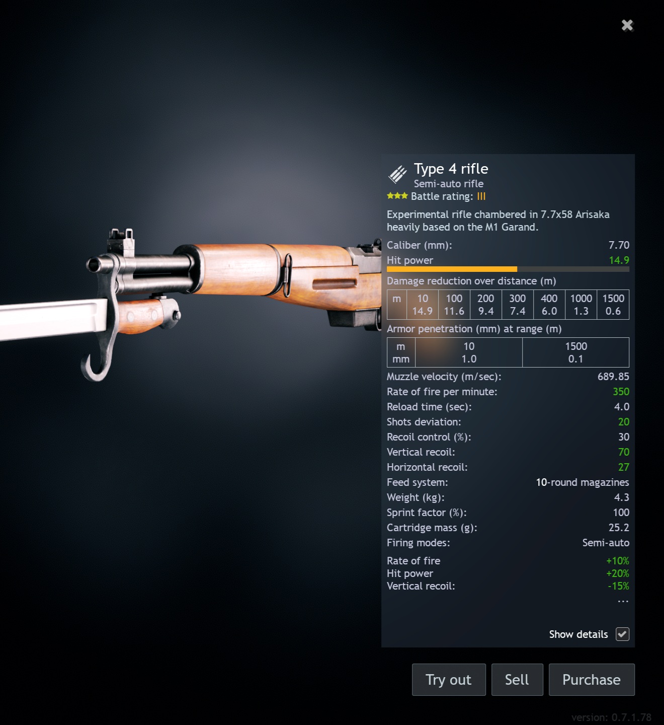 Type 4 Rifle - 350RPM ---------------> 14.9 dmg [7.7mm Arisaka at 725m/s]
