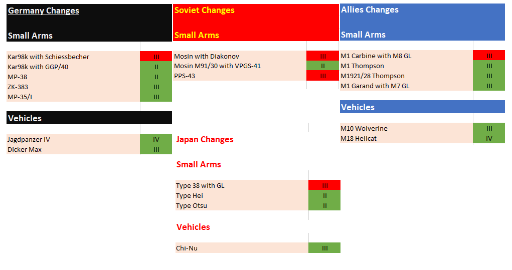 I’d suggest moving the 43 up to III and to move the MP-38 and Beretta M1 down to II