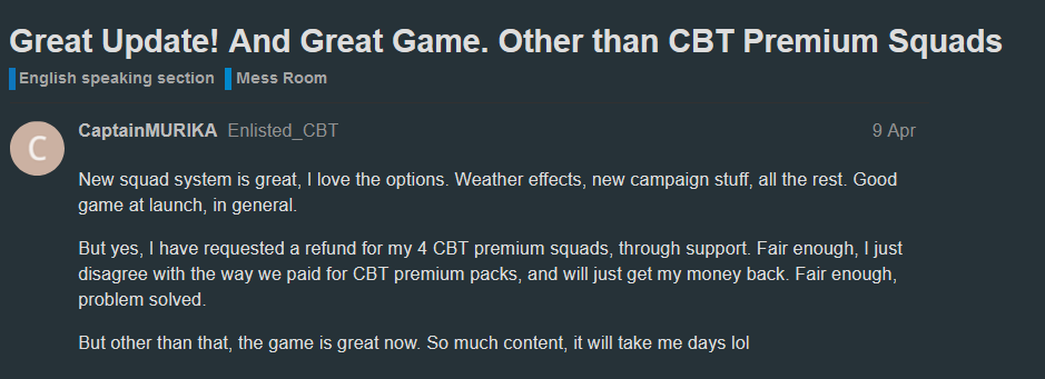 Overall balance is fine. I’ve been complaining about CBT premium squads, but they are actually fine. But only for next maybe month. Once everyone is leveled to decent levels, CBT premiums will become useless - regular squads are better.