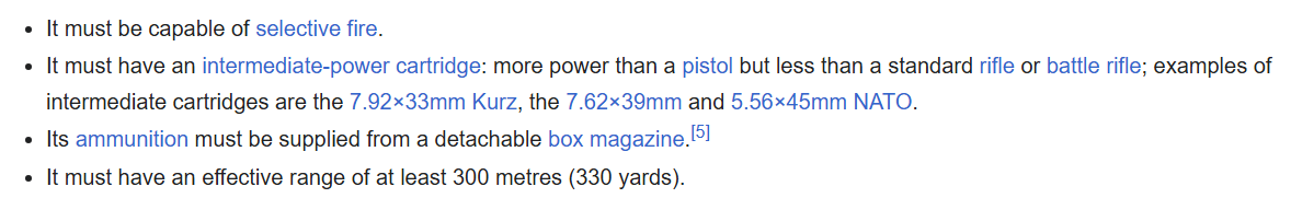 If the barrel is shit or the design is bad or doesn’t care about accuracy, suddenly it isn’t an assault rifle. This is the stupid shit you run into when you draw an arbitrary performance line. It’s like saying something can’t be an SMG unless its firerate is at least 200rpm.