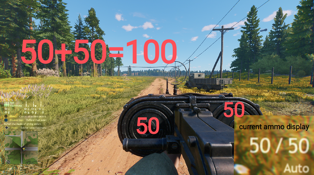 The type 100 mg fires 2 individual projectiles at once, however the game treats the 2 projectiles as 1 on the stat card and on the ammo display. The ammo readout should show how much ammo is physically in a gun NOT HOW MANY TIMES IT CAN BE FIRED, in most cases this definition would make no difference to the ammo readout but the type 100mg is an exception.
