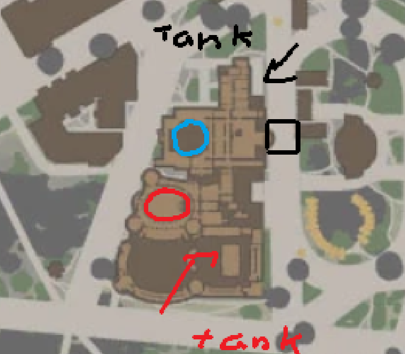 This setup might be better: the capture point’s are all very close or inside the building, so it’s not asymmetrical to the point where one side dominates the building while the other side captures an open air point. Each point is surrounded by buildings, and yet a lot can go on within them. Lot’s of cqc, and vehicles have a main survey of the objective in middle and the road. Not with impunity though, since infantry can attack the tanks from above the kroll opera house. It’s perfect for heavy action, gun blazing FUN!!! Rallies in this game mode should be allowed 35m (i think that’s the closest on some maps) of the capture point. APC’s can still be deployed around and outside the building.
