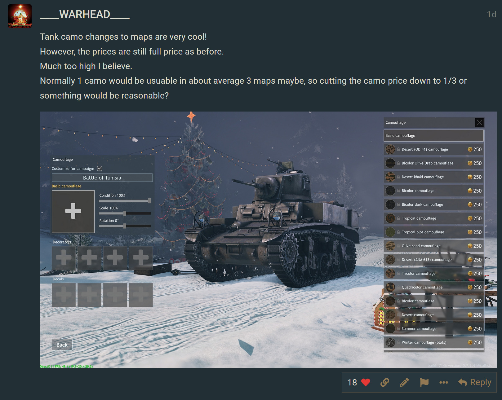 For the pricing , it s not really a suggestion. I preffer to pay 250 gold for a winter camo wich I can transfer to my actual using tank, not 250 gold for a camo locking for only 1 tank even if I dont use it