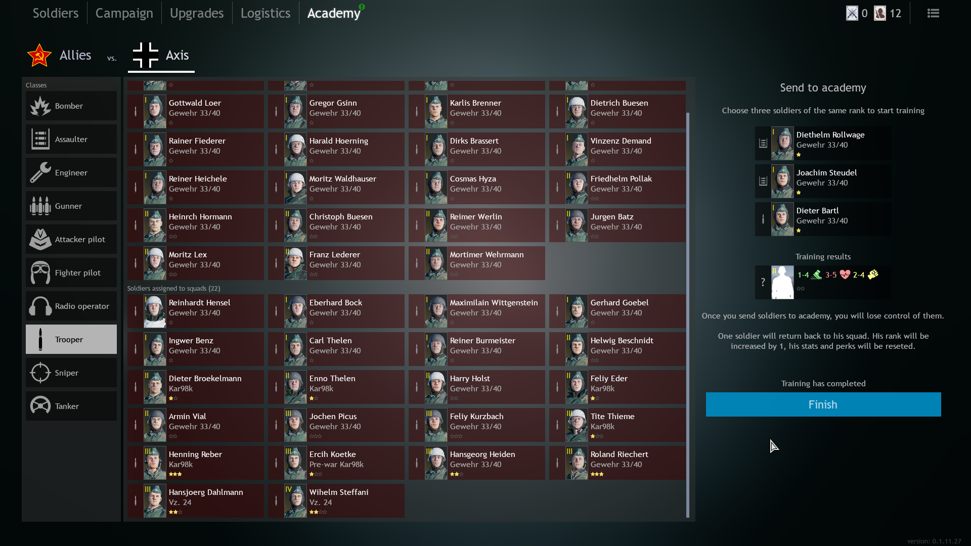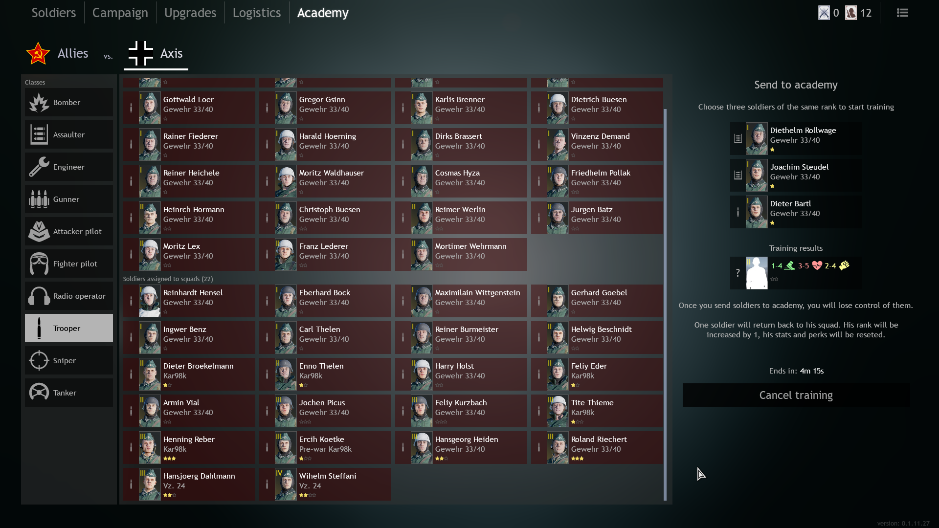 During open alpha test in May, it was, only same class of soldiers can be sent to the academy.