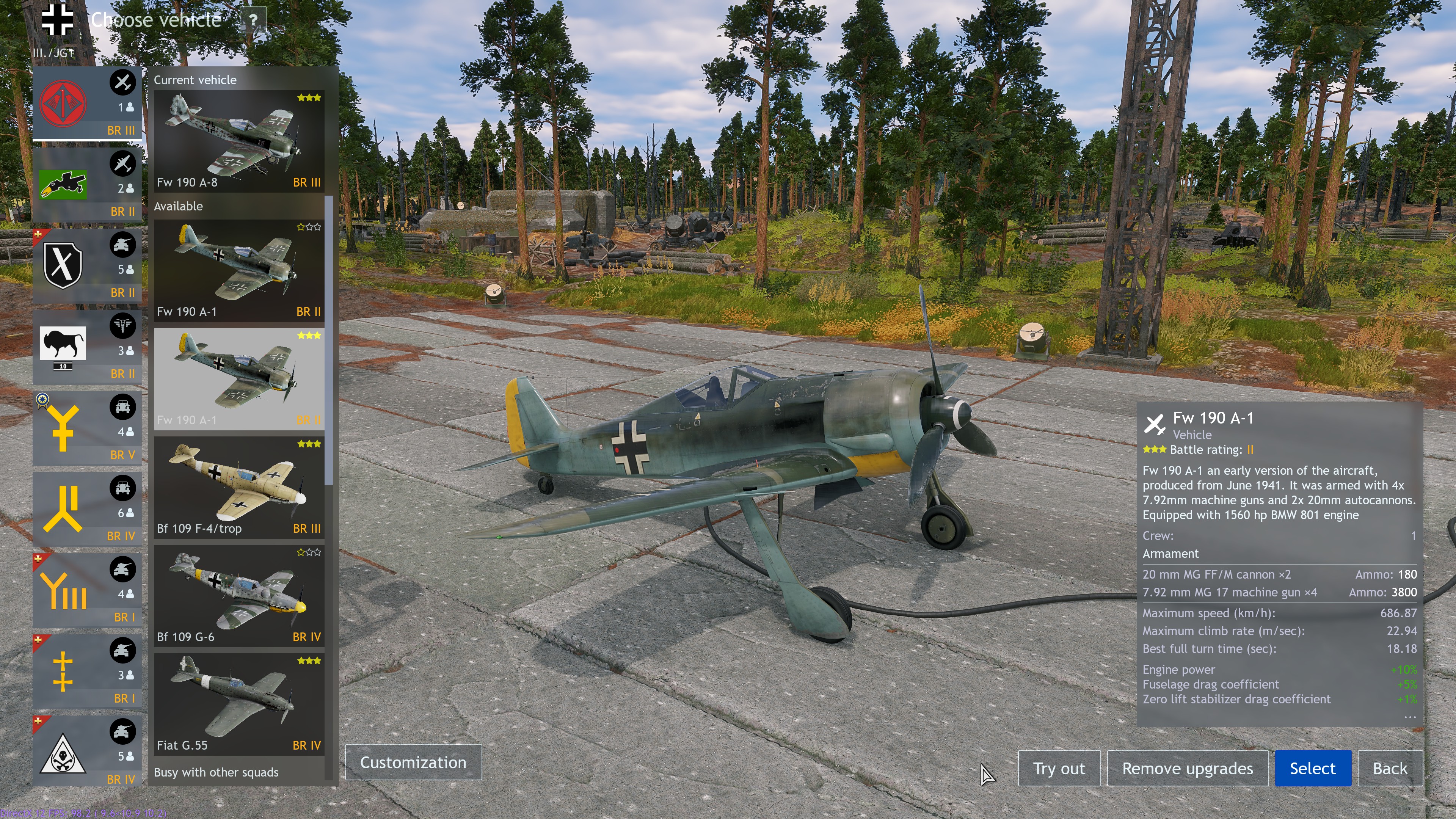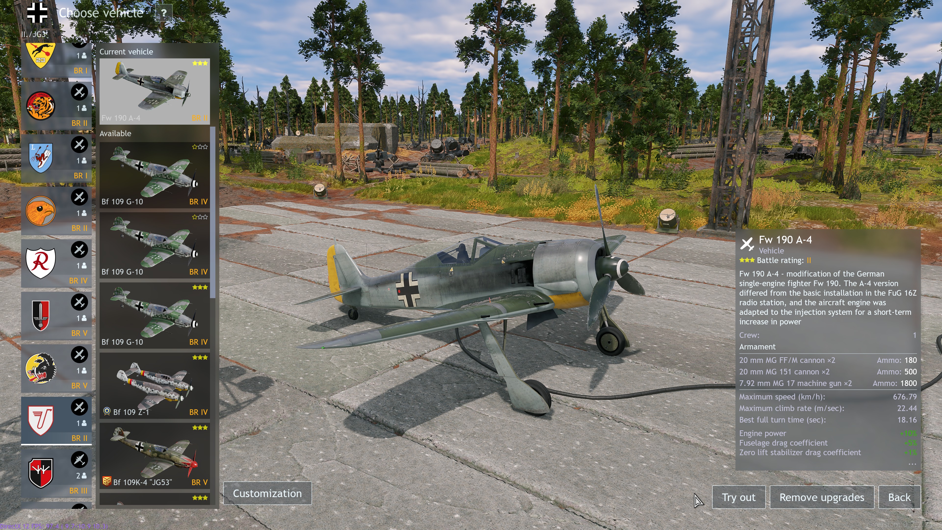 Fw 190 A-1 (BR II) I think it fits perfectly here as it has no ordnance but is quite speedy for the BR and while the flight model is a bit wonky it has 4x 8mm mgs and 2x 20mm cannons so it’s more than capable of tearing down any plane that it faces, as it should.