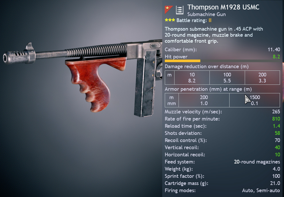 Well, IMOP the M1921’s 20 round magazine makes it BR2, however the rate of fire of 1040 is too high for BR2. It basically should mirror the M1928 USMC Thompson to remain in BR2, or give it a 30 round magazine and push it to BR3.