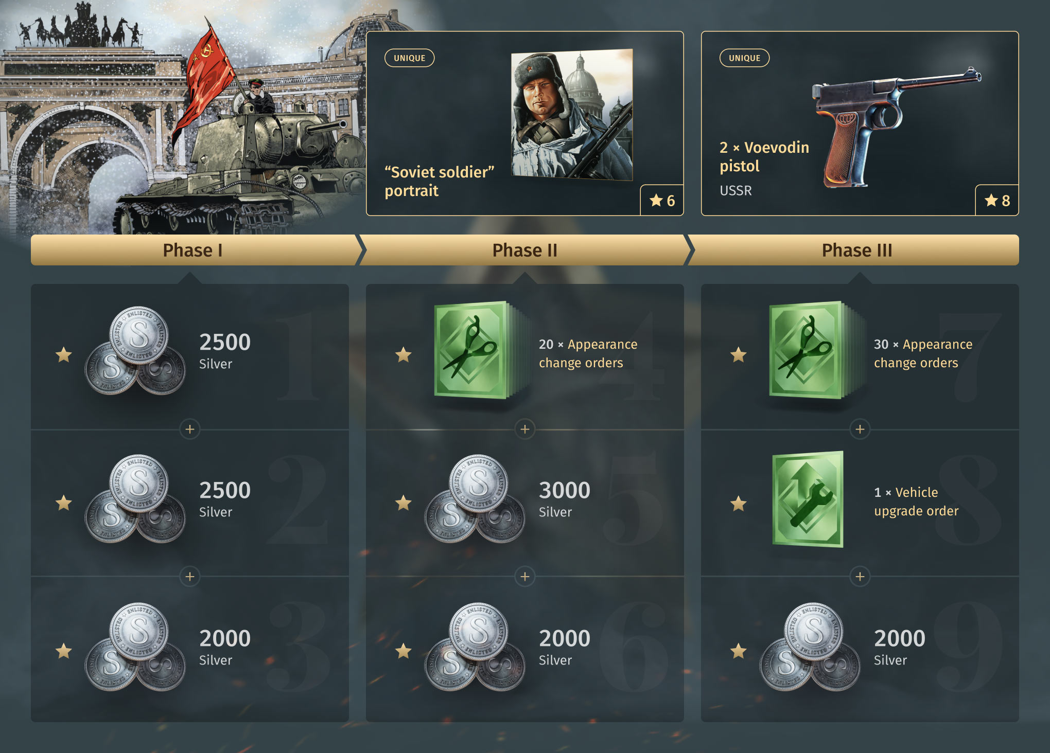 For completing 6 out of the 9 tasks, you will receive a unique portrait, and for 8 completed tasks, two unique Voevodin pistols!