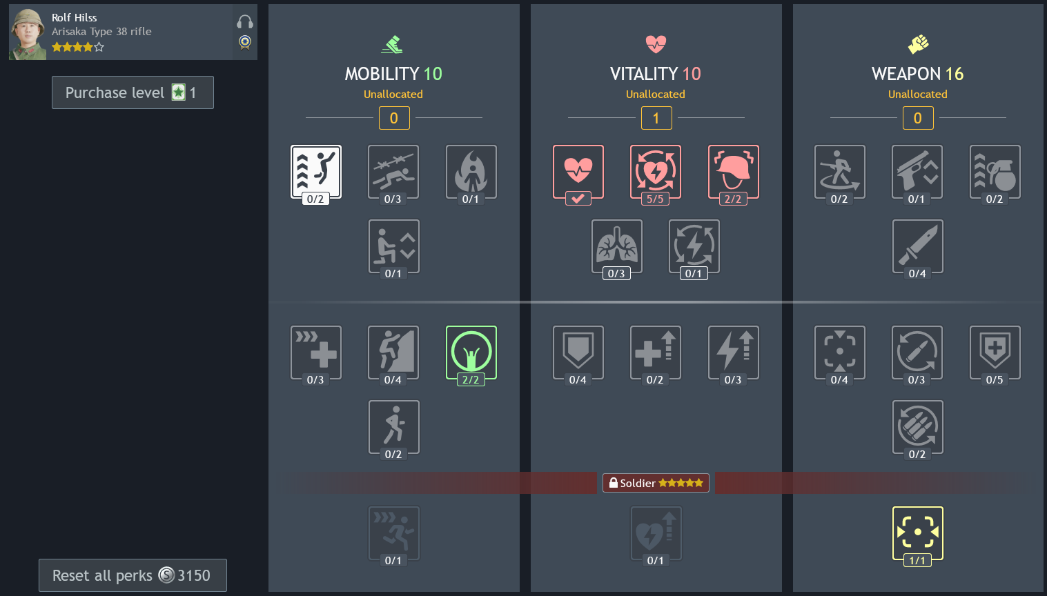 So there I am, levelling up my new Japan Radio squad. I go to check out their perks and I basically want to reset the entire page to use my points as shown in the image of the engineer. I kinda want to do that setup on every soldier in the squad. However, resetting all perks costs 3,150 silver per soldier.