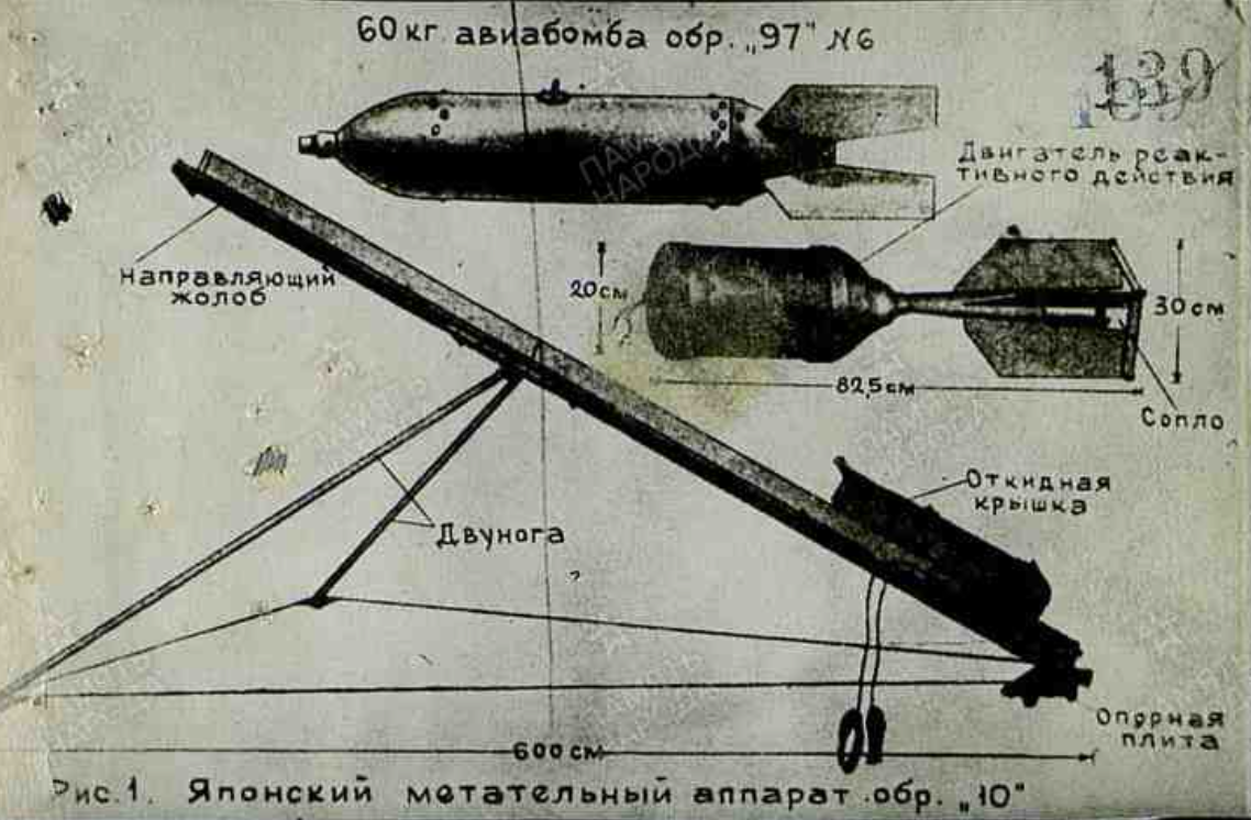 The Japanese are currently conducting experiments to launch a rocket. This mortar is a regular mortar that does not have a bottom part. Instead of the bottom part, there is a limiter that holds the rocket projectile in the lower part of the mortar. The length of the mortar is 2470 mm, the weight is 250 kg. The mortar has a lifting mechanism that allows you to give the mortar an elevation angle from 18 degrees to 05 (perhaps poorly written). A sight from a 150 mm type 96 mortar is used to aim the mortar. The mortar is fired from 900 to 1600 meters. The mortar is transported on three packhorses.