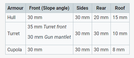 Turret armour is 30mm front, 35mm mantlet, 20mm side.