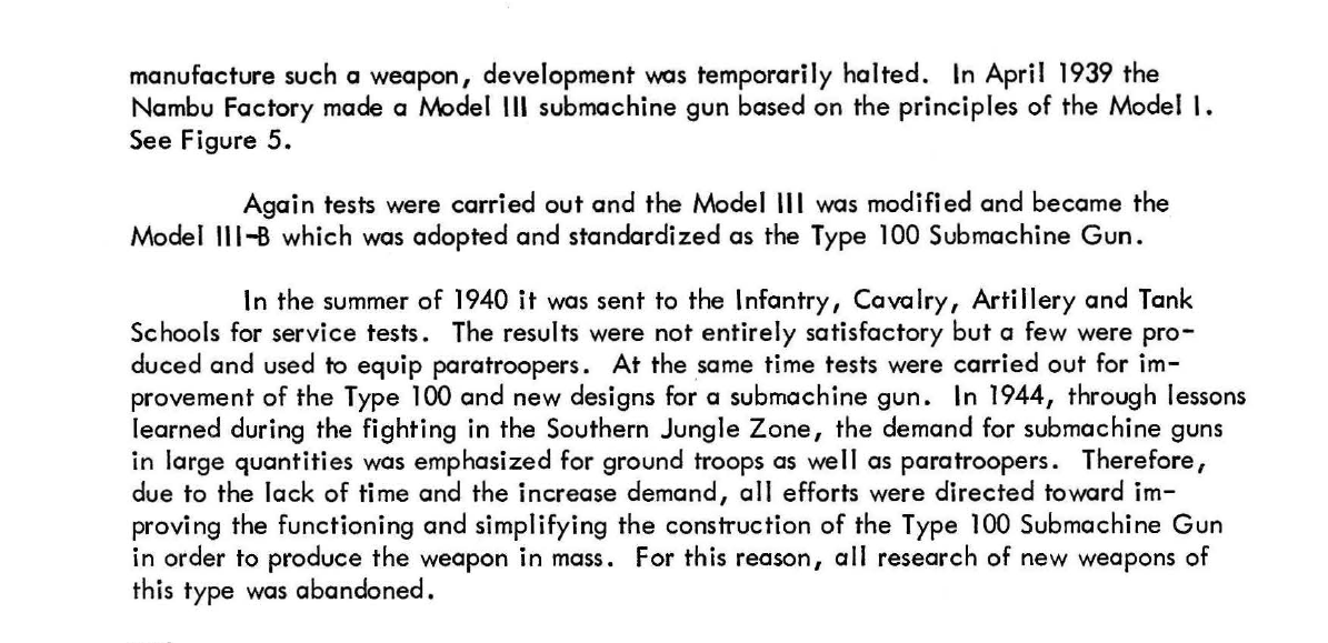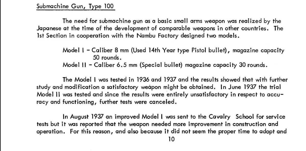 But I prefer calling them the Nambu Model 2 Ko (6.5mm caliber) and Otsu (8mm caliber) submachine guns. And it is obvious that this refers specifically to the Nambu Model 2 submachine gun. The section is titled “Submachine Gun, Type 100” because it goes on to discuss the development and adoption of the Type 100.