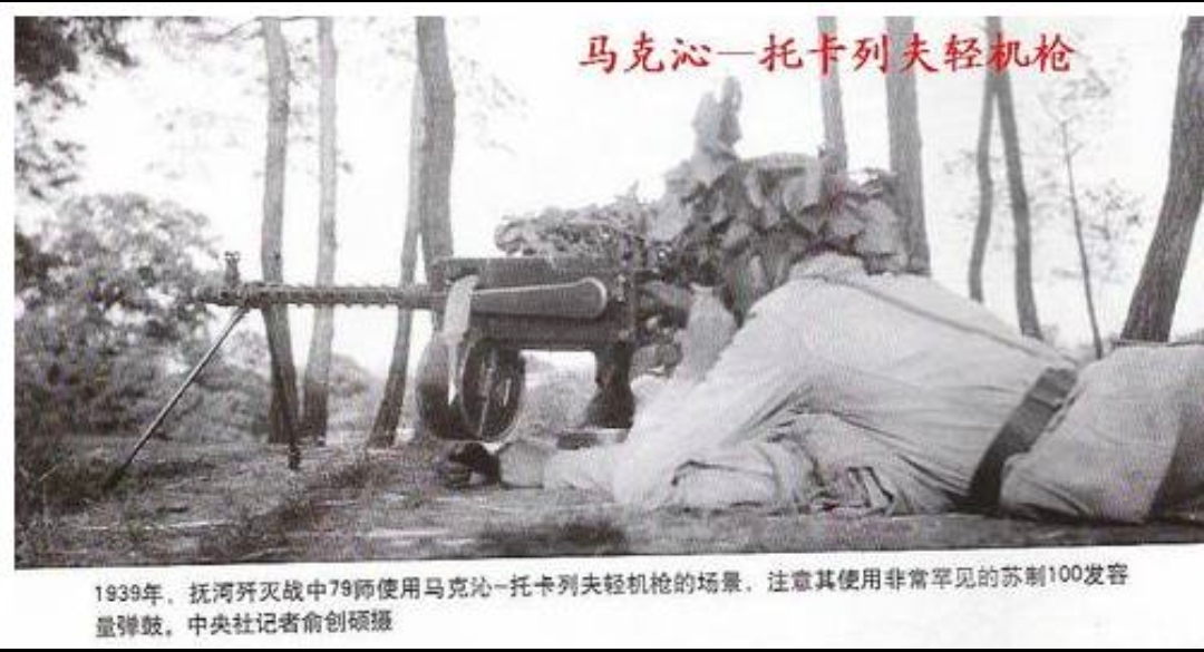 In 1939, during the Fubei Annihilation Campaign, the 79th Division employed the Maxim–Tokarev light machine gun. Notably, the weapon was fitted with a highly rare Soviet-made 100-round drum magazine. Photograph by Yu Chuangshuo, central news agency correspondent.