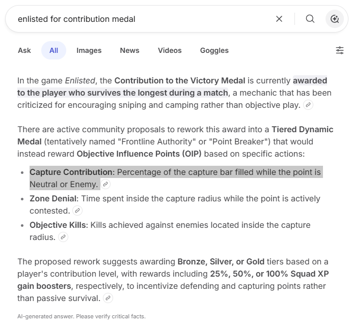 Enlisted already tracks everything needed for this system: capture progress, player location in zones, and kill feed data. This proposal doesn’t require new mechanics—just a new way to weight and combine existing data to award medals.