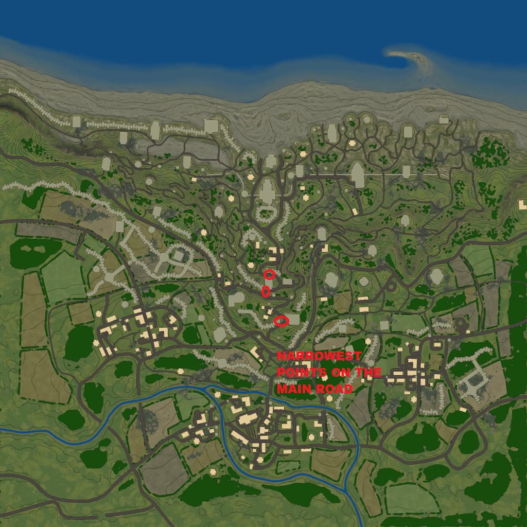 second picture is the narrowest points on the main road. dig exactly the same big pits there if you lost the first and second objective