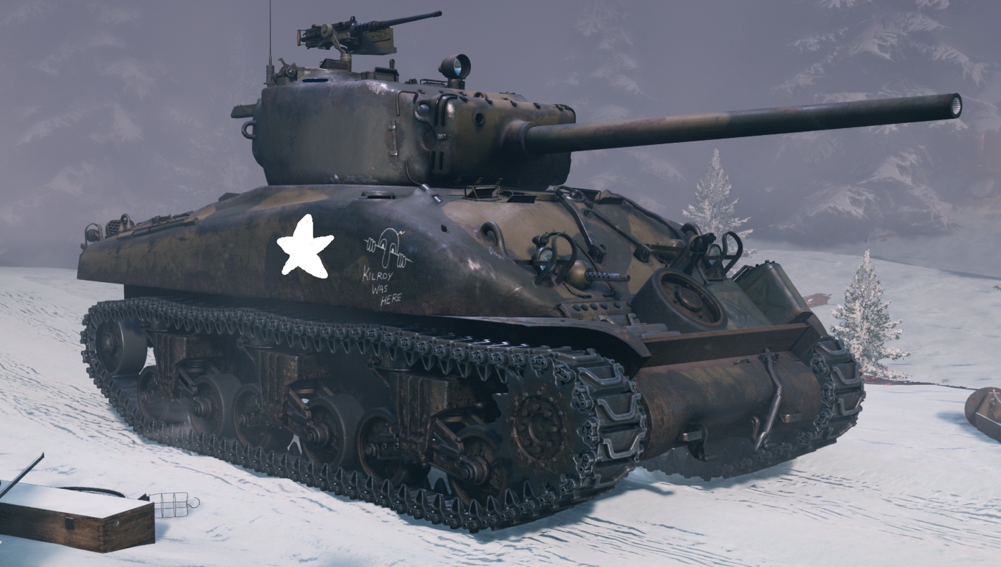 Interestingly, you can spot some faction insignias on the promotional art for the game. The banner with the sherman calliope has white stars painted on, while the in-game vehicle doesn’t.