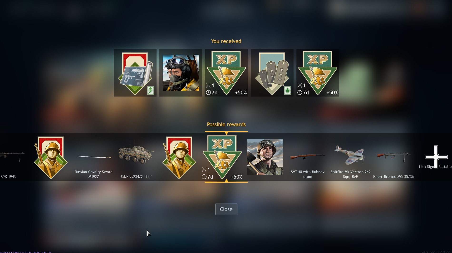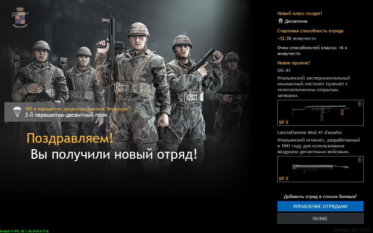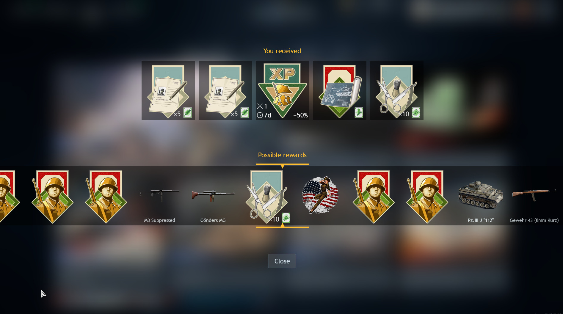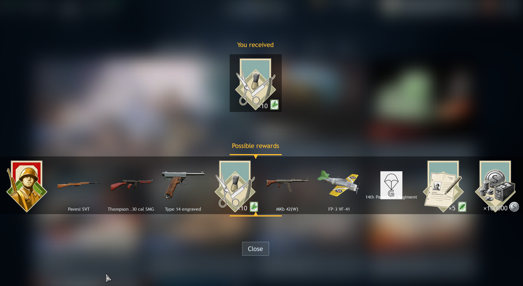 I spent 700k again just for italian paras(also kind of hoping to get any axis para) and got USA para, Kv1, A13,Stuart,Me410,Beretta 1918,STG44,PPD34,Fedorov,Murata,Yak, a camouflage for tank, couple of soldiers and boosters and rest classic orders and portraits as far as I remember, I was kind of sad and stopped wasting any further silver and decided to look at the my factions to see what I got and I saw Fg42 paras in my squad list, it was a nice surprise lol