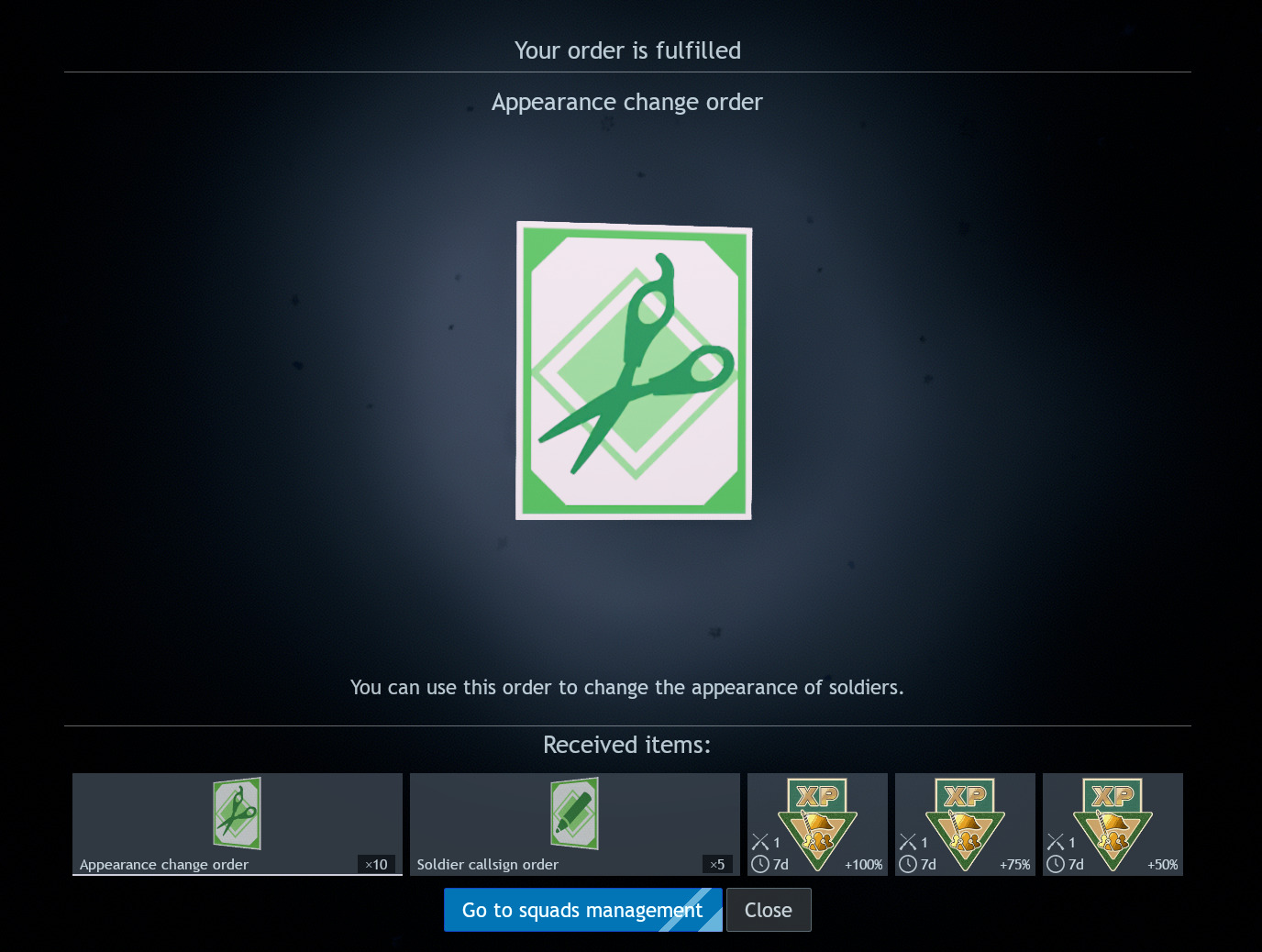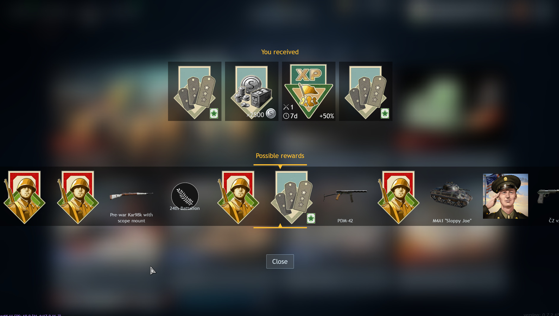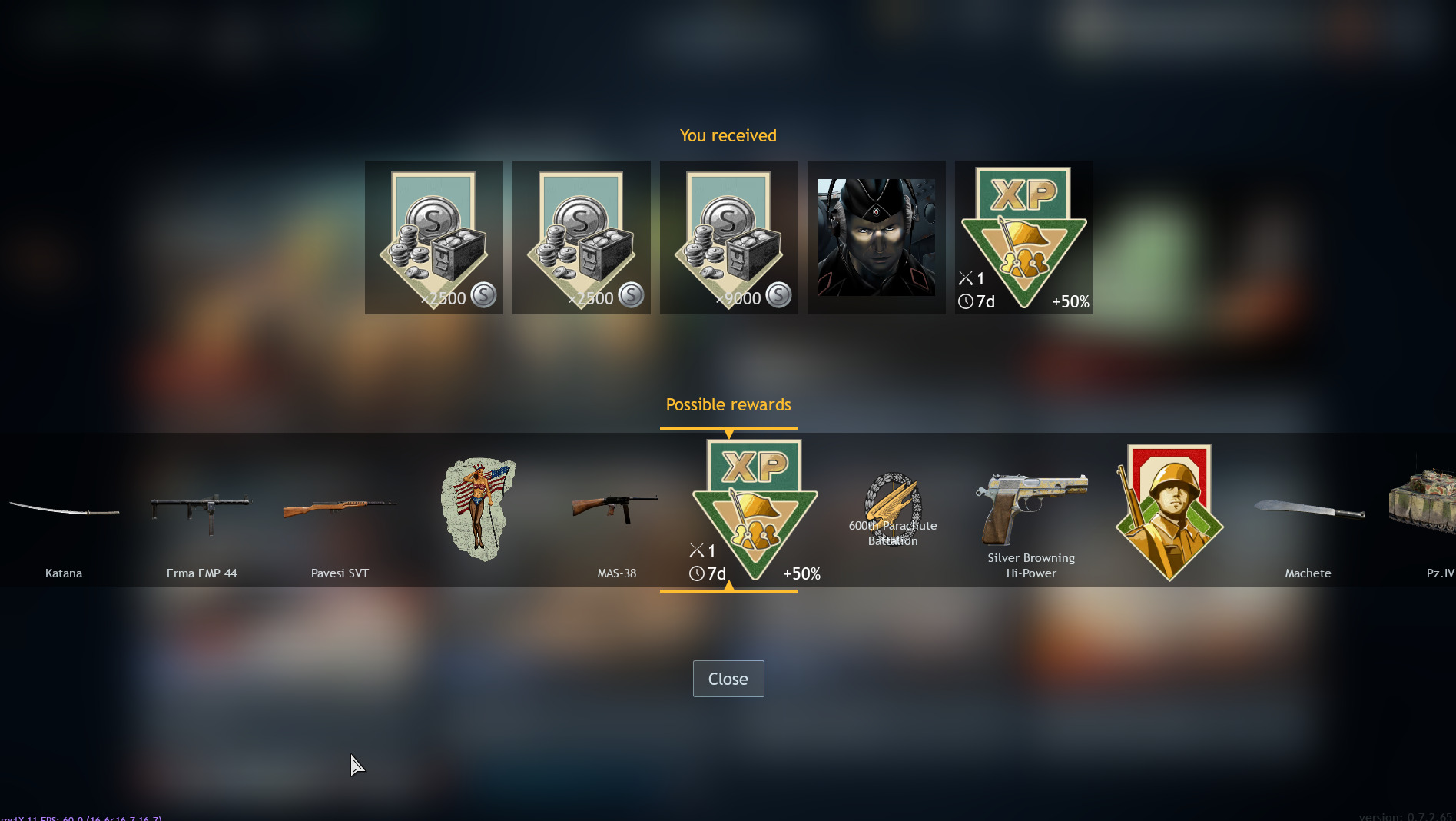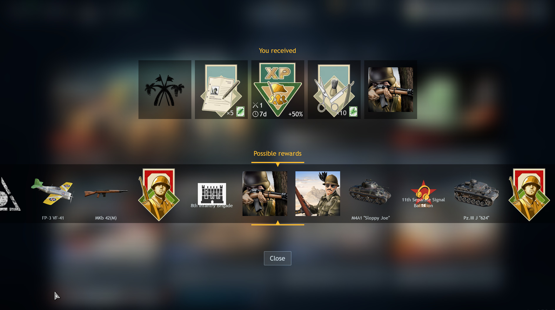 I spent 700k again just for italian paras(also kind of hoping to get any axis para) and got USA para, Kv1, A13,Stuart,Me410,Beretta 1918,STG44,PPD34,Fedorov,Murata,Yak, a camouflage for tank, couple of soldiers and boosters and rest classic orders and portraits as far as I remember, I was kind of sad and stopped wasting any further silver and decided to look at the my factions to see what I got and I saw Fg42 paras in my squad list, it was a nice surprise lol
