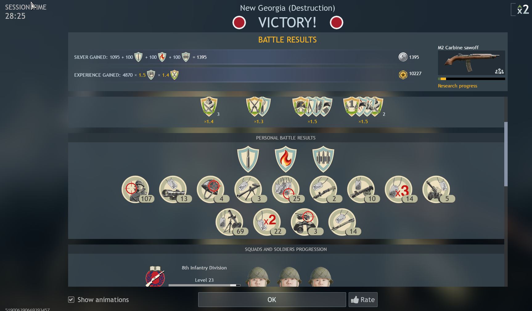 I only lost two or three squads this game, so that was all done with one squad playing once. I have four and use them as main weapon, so I have eleven rounds, and i have one engineer so I am constantly building ammo boxes to keep refilling them. Once one of them dies, I pick up the Ariska with another soldier, refill the ammo and have eleven new rounds. Seven man squad I use with the Japanese, and a nine man squad when I play with the Soviets, so, as long as I can protect my engineer, I can cause a lot of damage. :joy: The following game I had 59 Ariska kills, but didn’t post it.