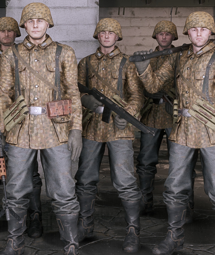 The Platanenmuster autumn camo only has a helmet and tunic available to wear. This is in contrast to the spring variant which features the helmet, tunic, AND pants.
