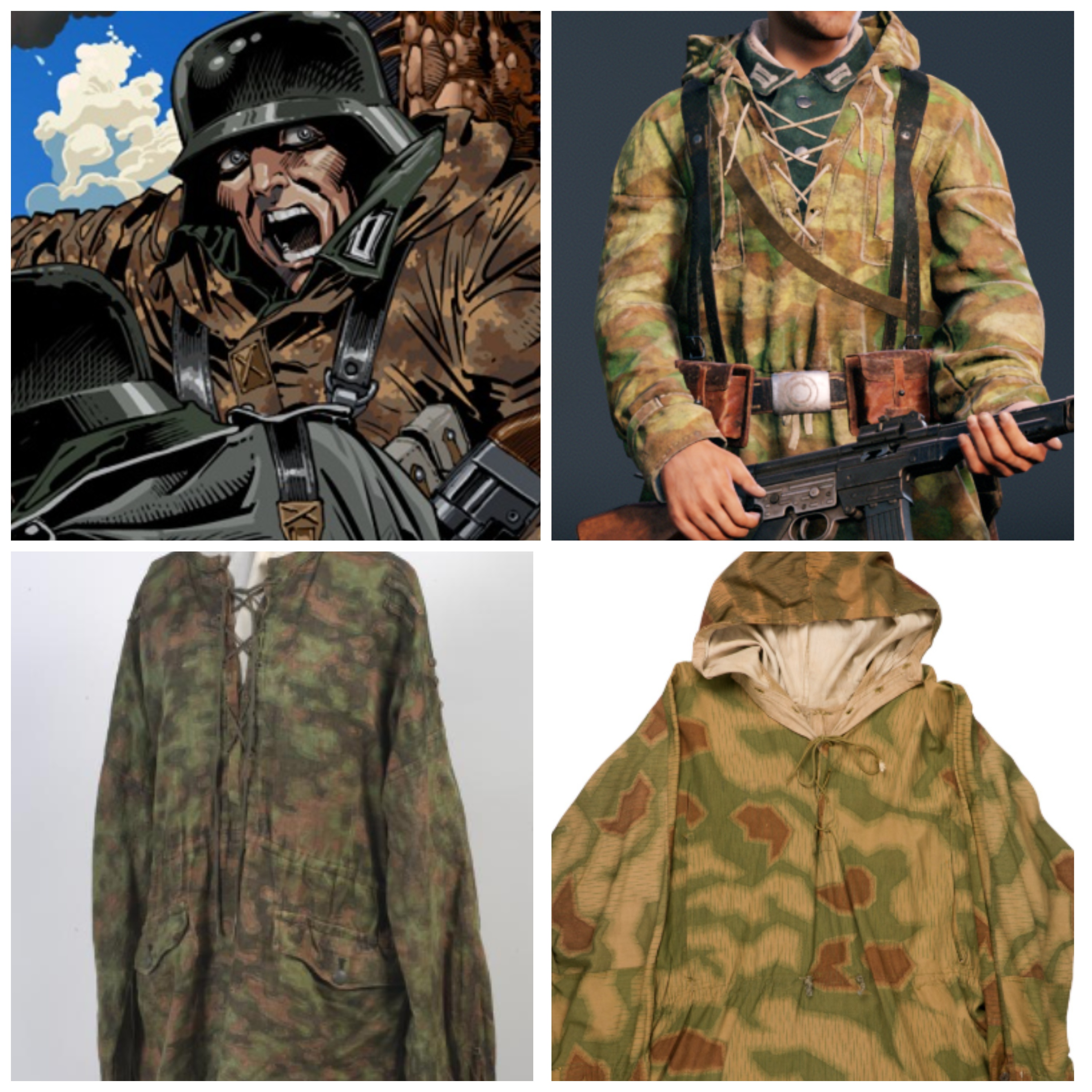 First of all, this camouflage uniform we asked back is based on a real field made plane tree tunic, and from the pictures we see, we could tell that there is absolutely no sorts of Wehrmacht patches as Waffen SS camouflages were strictly patented.