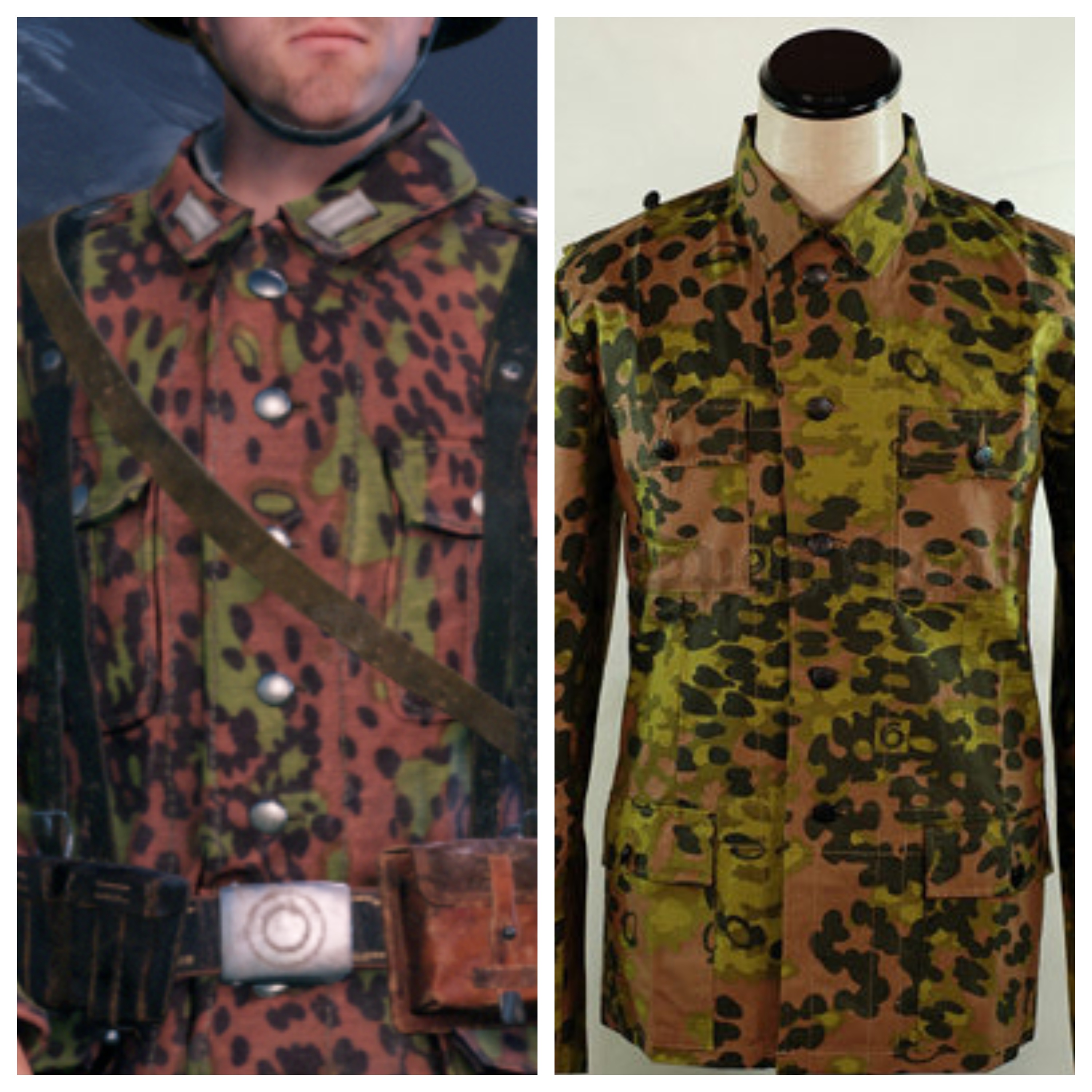 First of all, this camouflage uniform we asked back is based on a real field made plane tree tunic, and from the pictures we see, we could tell that there is absolutely no sorts of Wehrmacht patches as Waffen SS camouflages were strictly patented.