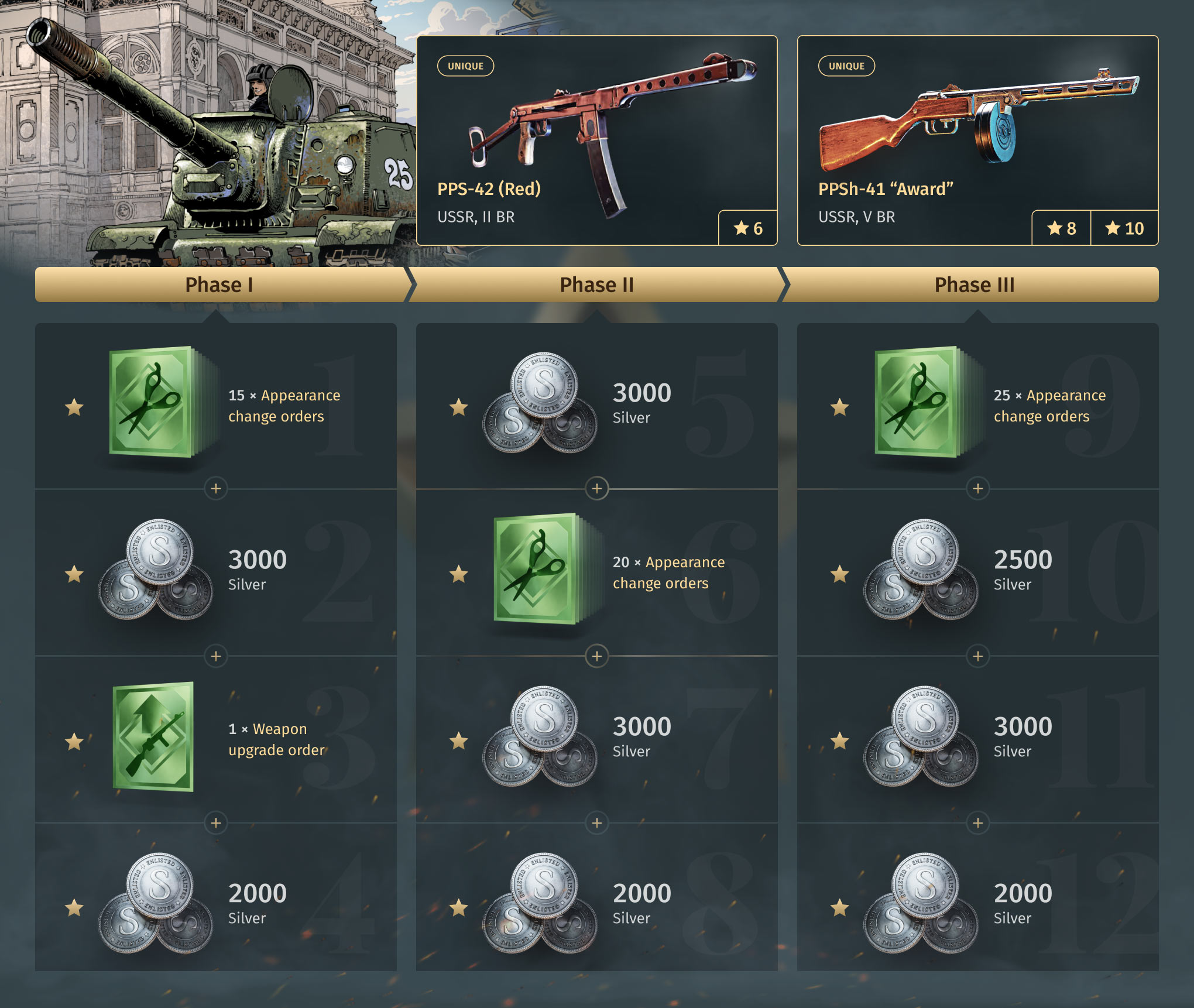 Each Phase no longer receives weapons, but instead receives an order for the event weapon.You can choose to exchange for either German weapons or Soviet weapons.