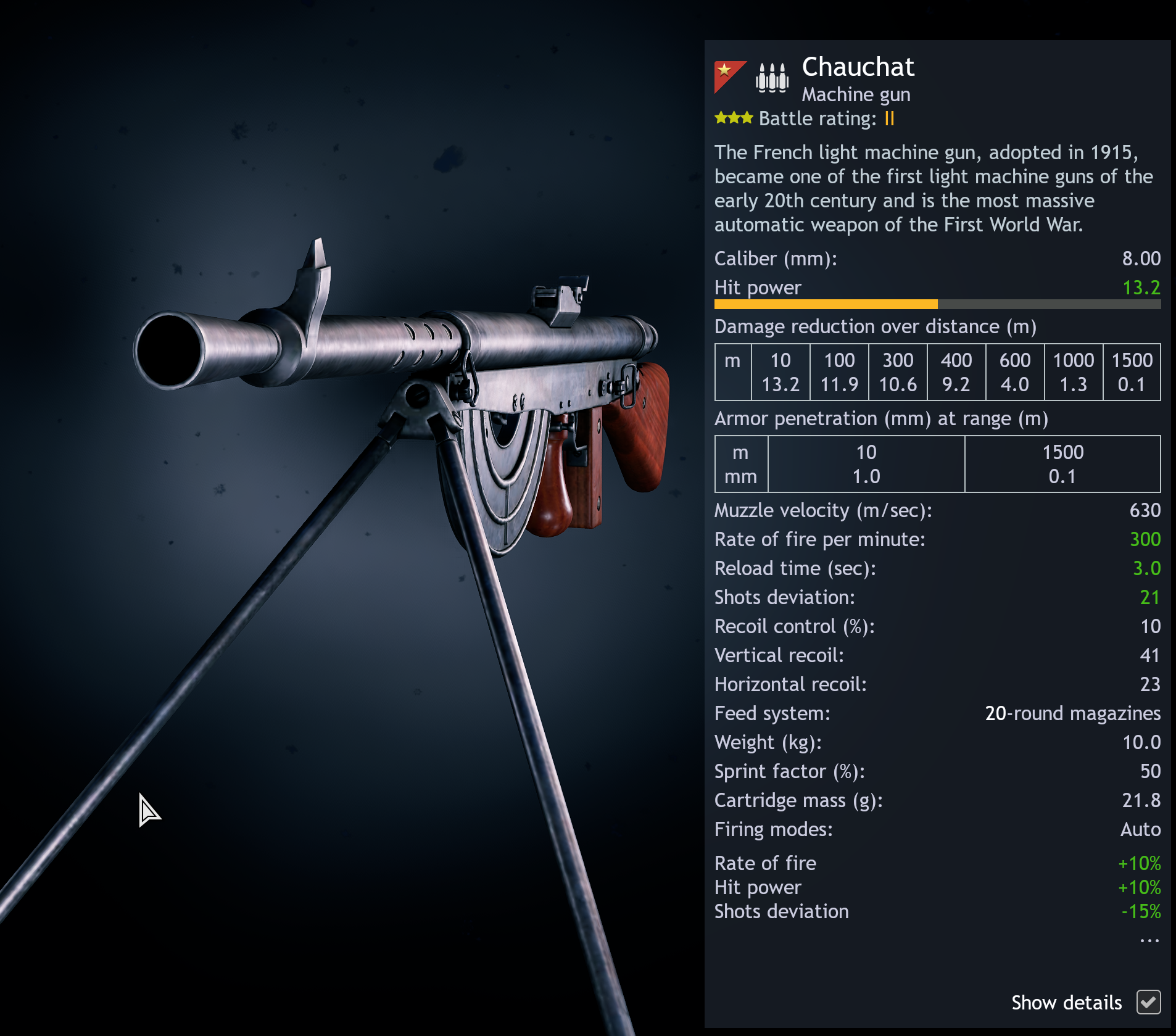 Rate of fire per minute is extremely low, being only 300 RPM which is even lower than the semi-auto rifles in BR 2. It also comes with -50% sprint speed penalty and very slow aim down sight speed, the usual LMG penalties we all familiar with. I think it’s reasonable to suggest move Chauchat to BR 1 from BR 2.