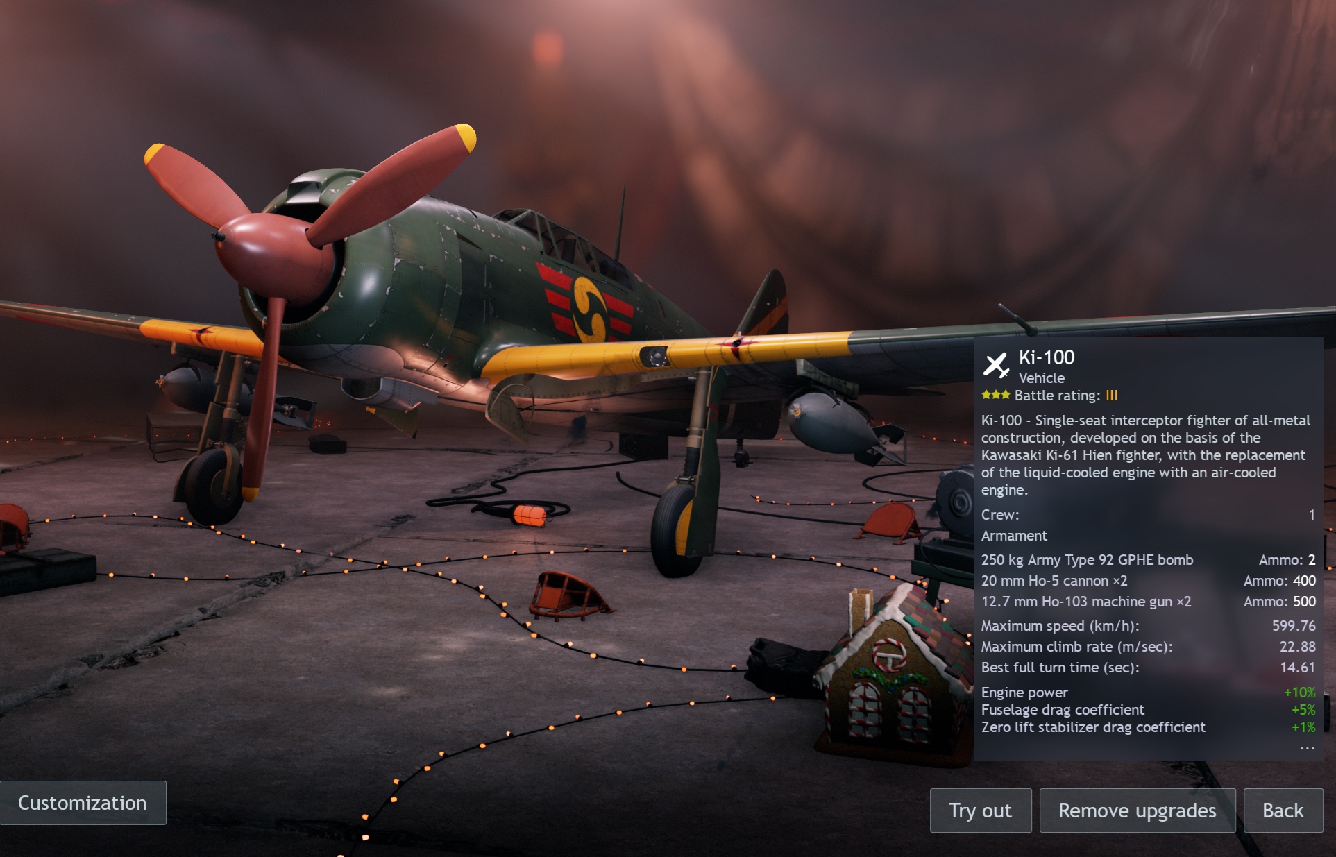Its very good aircraft in war thunder and super iconic but here its underperforming in war thunder normally Ki 61 is better then Ki 100 here its the other way around the more time passed the Ki 100 value increased with the more variety of enemies being introduced while the Ki 61 value decreased do to events, TT changes that introduced more and more UK aircrafts and now with the Soviet planes that are also very good at dog fights the Ki 61 value gone down and its payload also is not amazing. The only good things is the ammo capacity that is iconic to Japanese aircrafts. But its average plane very similar to the German BF 109 with worse stats but more guns but since Japan lacks planes at lower BRs that perform good a high altitude this one will be very welcome variety in BR III.
