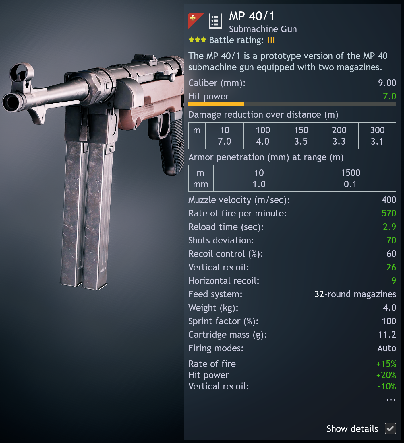 What this is, is just basically a glorified MP 40 with this unique mechanism that let’s you switch up to the other magazine quickly(This still takes like full 1 second, as well as actually slower reload speed than the regular MP 40 by having 0.8 secs more if 2 magazines spent or performs tactical reload)after fully spending the magazine that’s currently feeding.