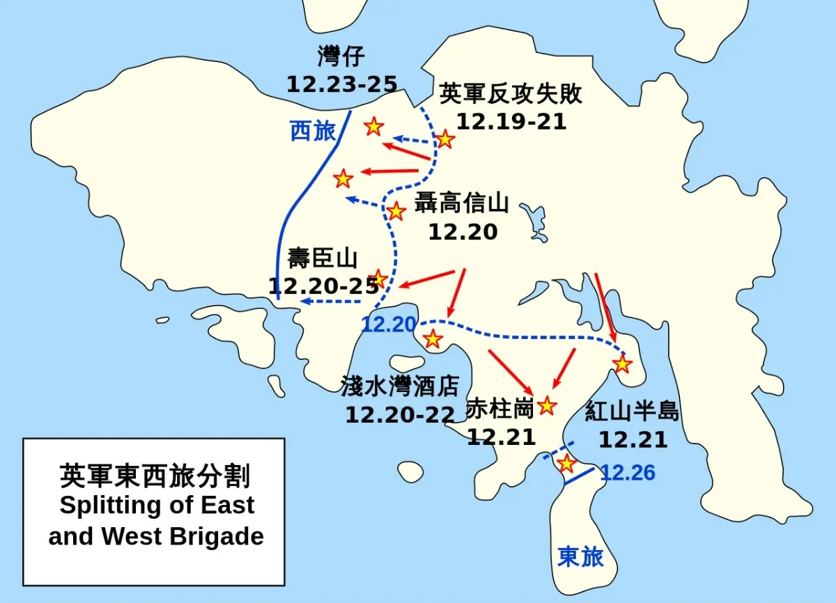 The situation map of the division of the British Eastern and Western Brigades shows that since the fall of Repulse Bay on the 22nd, the defense lines of the Eastern and Western Brigades have been continuously retreating southward and westward respectively. By around 3pm on the 25th, the Western Brigade’s defense line in the northwest of Hong Kong Island had retreated to Wan Chai Ship Street, while the Eastern Brigade barely held onto the Stanley Peninsula.