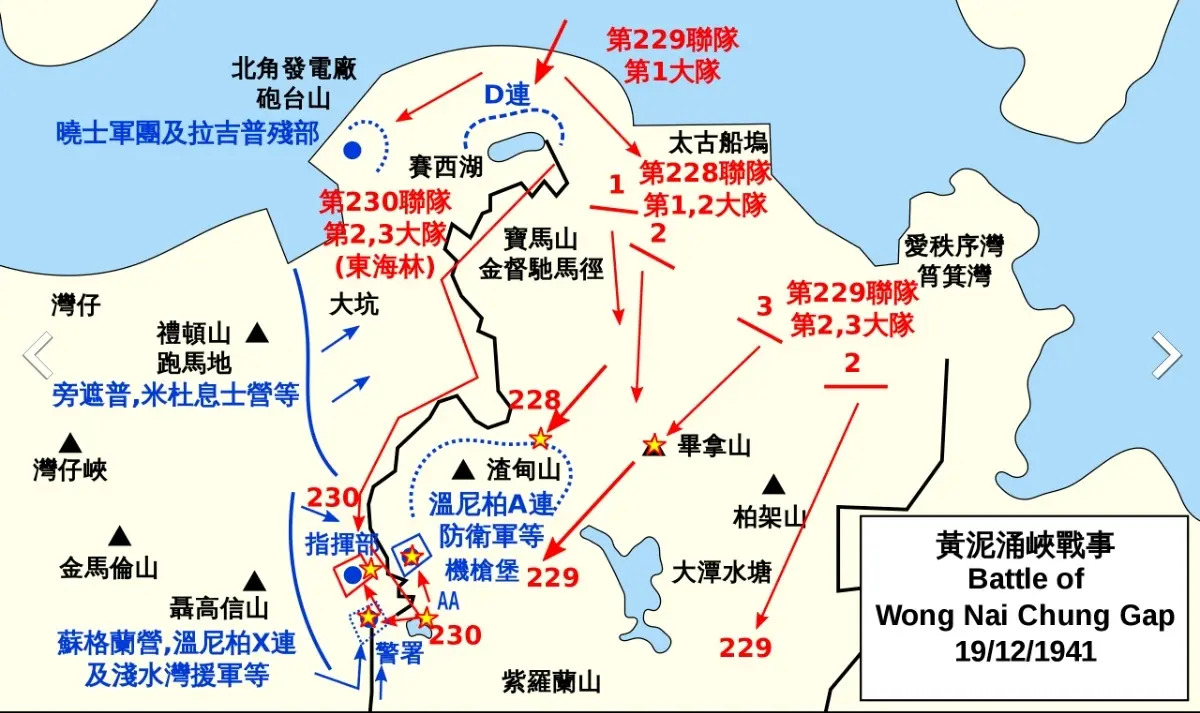 However, the 230th Squadron marched along the Golden Horse Trail in the early morning of the 19th, unexpectedly changing the situation on Hong Kong Island. Due to the strong resistance of the Xiaoshi Corps during the attack on the North Point Power Plant by the 2nd Battalion of the 230th Regiment, they were unable to capture the power plant and advance westward via King’s Road to Tai Hang by the late night of the 18th. Therefore, the Japanese army dispatched the 1st Battalion of the 229th Regiment as a reserve force from Kowloon to land at Braemar Point on Hong Kong Island, in order to strengthen their military strength on the island. The 230th Regiment decided to transfer the task of capturing the power plant and advancing westward via King’s Road to the 1st Battalion of the 229th Regiment, which came to reinforce them. The 2nd Battalion was transferred from the North Point Power Plant to Sai Westlake and marched along the same path as the 3rd Battalion, first heading south and then west. The 230th squadron plans to bypass the east and south sides of Mount BMW after these two squadrons arrive at Sai West Lake. When they reach the north side of Jardine’s Bazaar, they will then turn towards the direction of Tai Hang to advance and bypass a section of King’s Road in Fortress Hill and Tin Hau, attacking Tai Hang and Causeway Bay from south to north. Therefore, the 230th Squadron first besieged the remnants of the D Company of the Rajjep Camp at Sai Hei Lake, but when they forced back the 7th Platoon of the 3rd Company of the Hong Kong Defense Army, they were fiercely counterattacked. Although they captured two positions of the Defense Army at this location with their military advantage, five people from the 12th Squadron were killed. The captain of the 230th Squadron, Toshihide Higashi, estimated that there were a large number of British troops stationed at Jardine’s Bazaar and decided to take the Golden Governor’s Chariot Path south, then turn northwest on the way to Dakeng and attack Causeway Bay, thinking that this would avoid Jardine’s Bazaar. However, due to the fact that the Jin Du Chi Ma Trail was built along the mountain, with cliffs on one side and steep cliffs on the other, and the leader of the 230th regiment was unfamiliar with mountain roads but had to march in the dark, the 2nd and 3rd regiments of the 230th regiment entered the Jin Du Chi Ma Trail and not only failed to find the expected path to the big pit, but also walked all the way into the Huangniyong Gorge. Colonel Tokaido admitted afterwards that he was not familiar with the terrain of the area and was unaware of the British military’s deployment there; He was unaware that the southern route of the Jin Du Horse Racing Trail would be hindered by the mountain terrain, and there was a lack of a path to turn northwest towards Dakeng. Instead, he passed through Zhadian Mountain and penetrated deep into Huangniyong Gorge; He also had no idea that he was actually marching directly towards the British Western Brigade Command, let alone that Winnipeg Company A had not yet arrived at Mount Pinar for defense, and that the entire Golden Horse Trail was only guarded by a row of soldiers belonging to Winnipeg Company D.