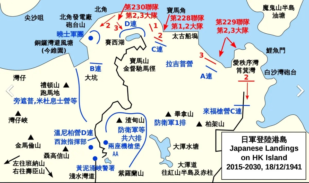 On the evening of the 20th, the 1st Battalion of the 229th Japanese Army arrived at the intersection of Tai Tam Road and Tai Tam Road Reservoir Road, and dismantled the pumping facilities after occupying the pumping station of Tai Tam Reservoir. The Wong Nai Chung Reservoir was also occupied by the Japanese army in the Battle of Wong Nai Chung Gorge, and power outages caused the pumps to be unable to operate, gradually paralyzing the water supply to Hong Kong Island. The 1st Battalion of the 229th Regiment once again invaded Hongshan, also known as Bai Bi Shan, after breaking through the defense line of the Hong Kong Defense Forces, and attempted to seize Lianhua Jing Shan and Guishan to the west of the Hongshan Peninsula. The British Eastern Brigade has set the counterattack time for 9:00 am on the 21st. The D-company of the Rifle Battalion and the 1st company of the Hong Kong Defense Force will launch a counterattack from Turtle Bay on Tai Tam Road, advancing to the intersection of Tai Tam Road and Tai Tam Reservoir Road. The two companies will dispatch teams to climb Lotus Hill and Turtle Hill to cover the main team’s advance;
