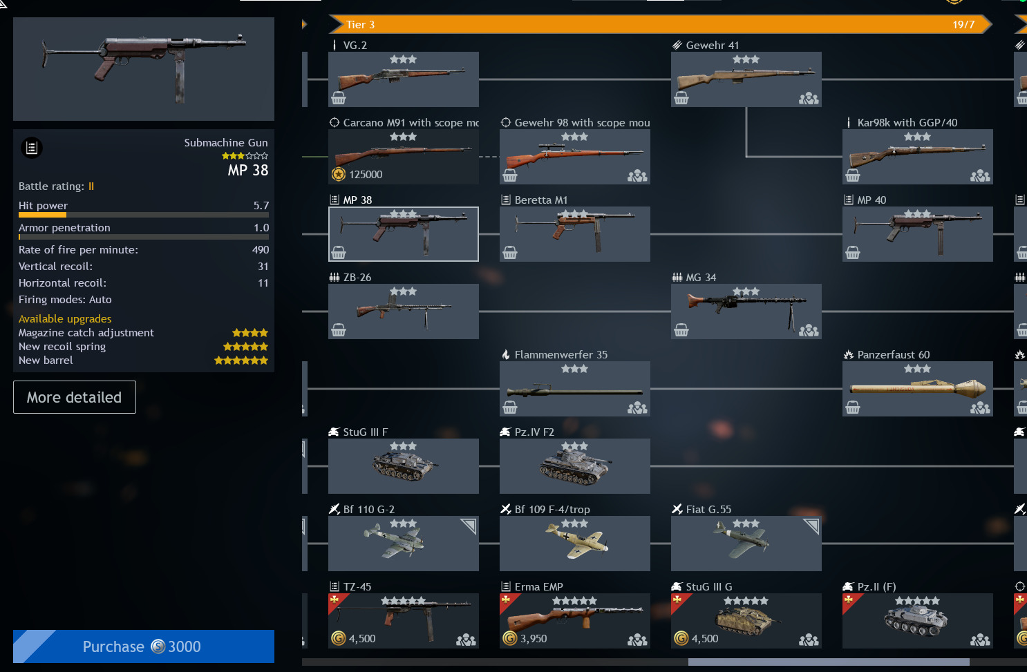 Germans: Get one of the Carcanos, IAR 81C, and MP 34 (o) for stable farming. Avoid going near the MGs.