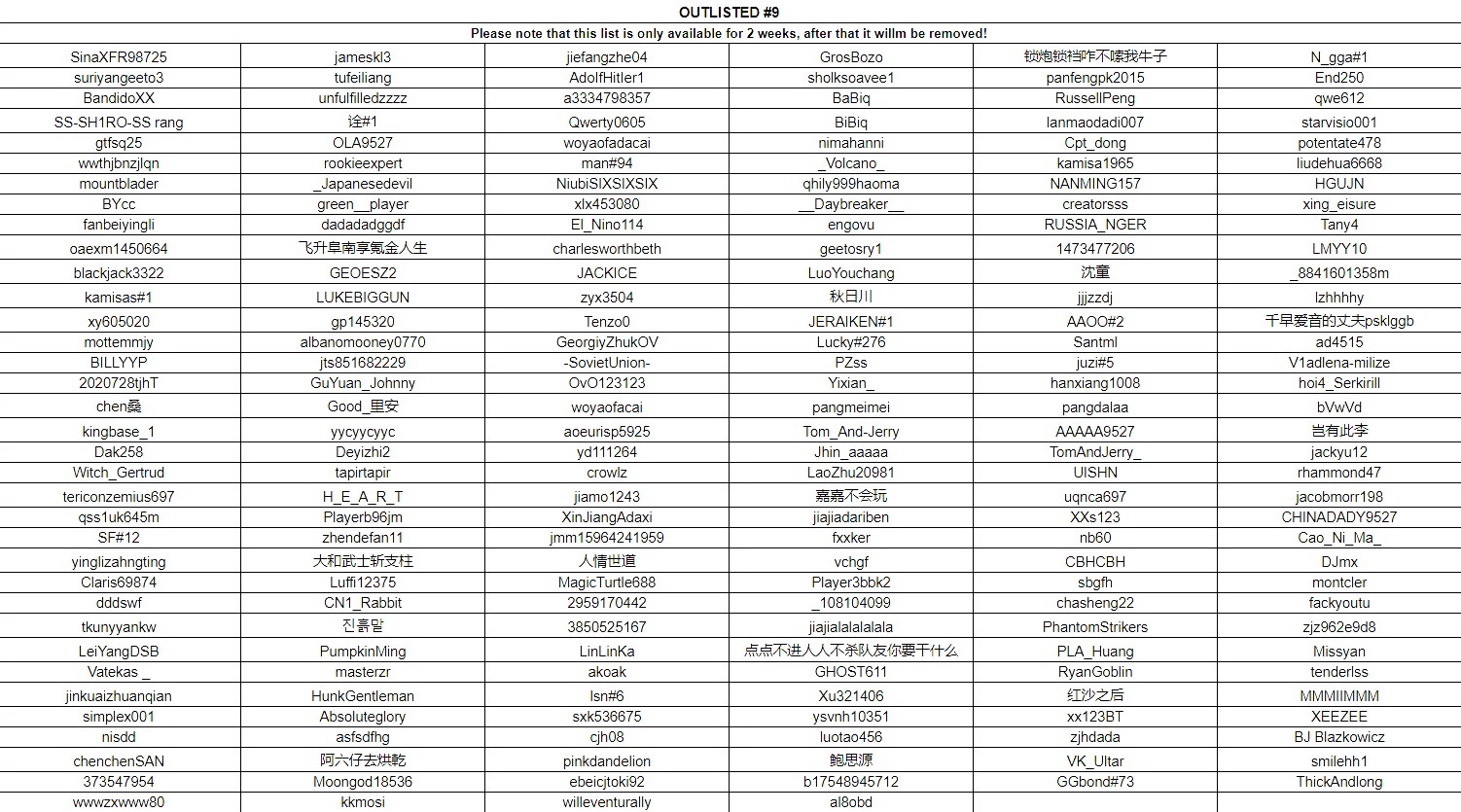 Greetings, commanders! As we promised in our first Outlisted, here is the latest list of players who have been banned for using forbidden modifications based on your complaints.