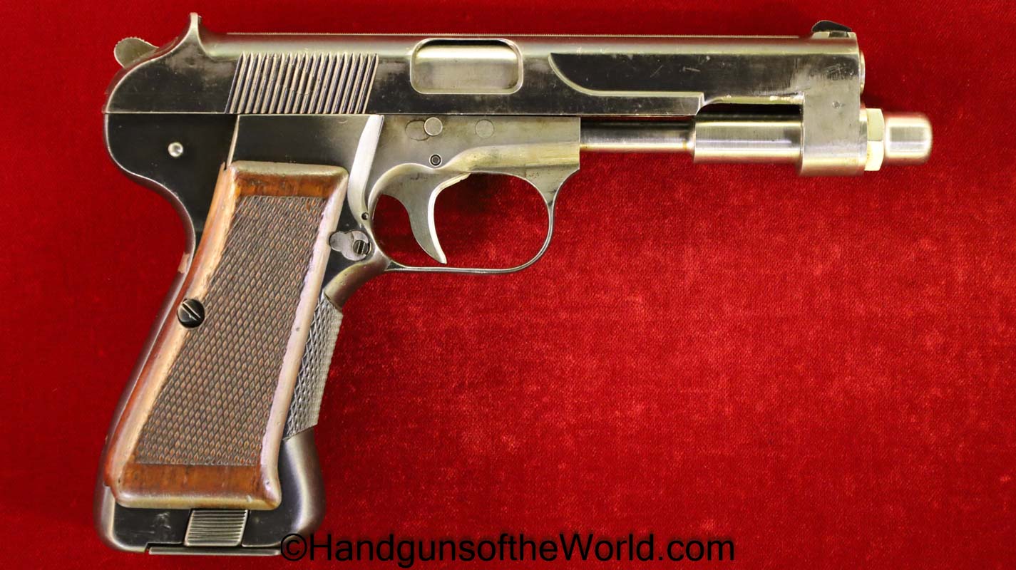 W&F Bern P-44/16 Experimental on a P-43 Bern, 9mm. This is a Mid production with a factory checkered front grip strap and checkered walnut grips. This has been factory altered to experiment with a gas delay operation. This is the experimental/transition to the P-47. This has all matching numbers to include the magazine. This is as factory altered with some parts added/removed with some filing and blue loss from the alteration. The bore is Mint.