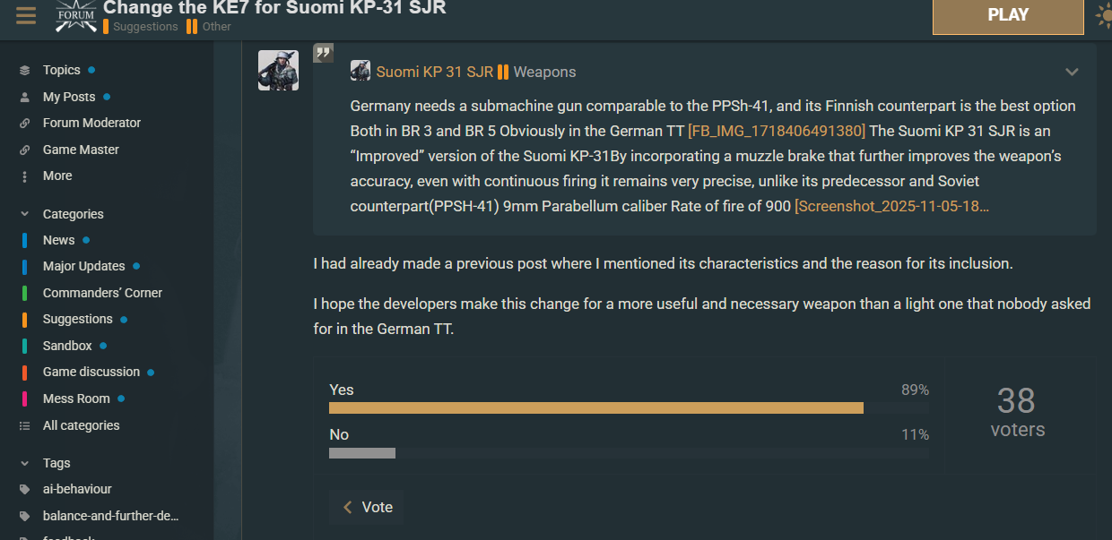 Can we do something about KE 7? It is boring copy paste and there is no proof that it was used by Italians or Germans. Kp 31 sjr has been sitting in editor for ages and should be added as a replacement since germany actually needs br 5 smg instead of br 3 mg. You switched ppsh 41 s with avt 40 20 so can we do it again?