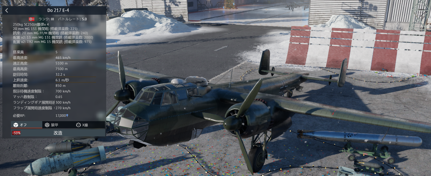 The Do 217E-4 would be a good option. This aircraft is capable of carrying six 250 kg bombs, and in addition it is equipped with one fixed 20 mm cannon, another 20 mm cannon in a gun position, as well as several small-caliber machine guns.